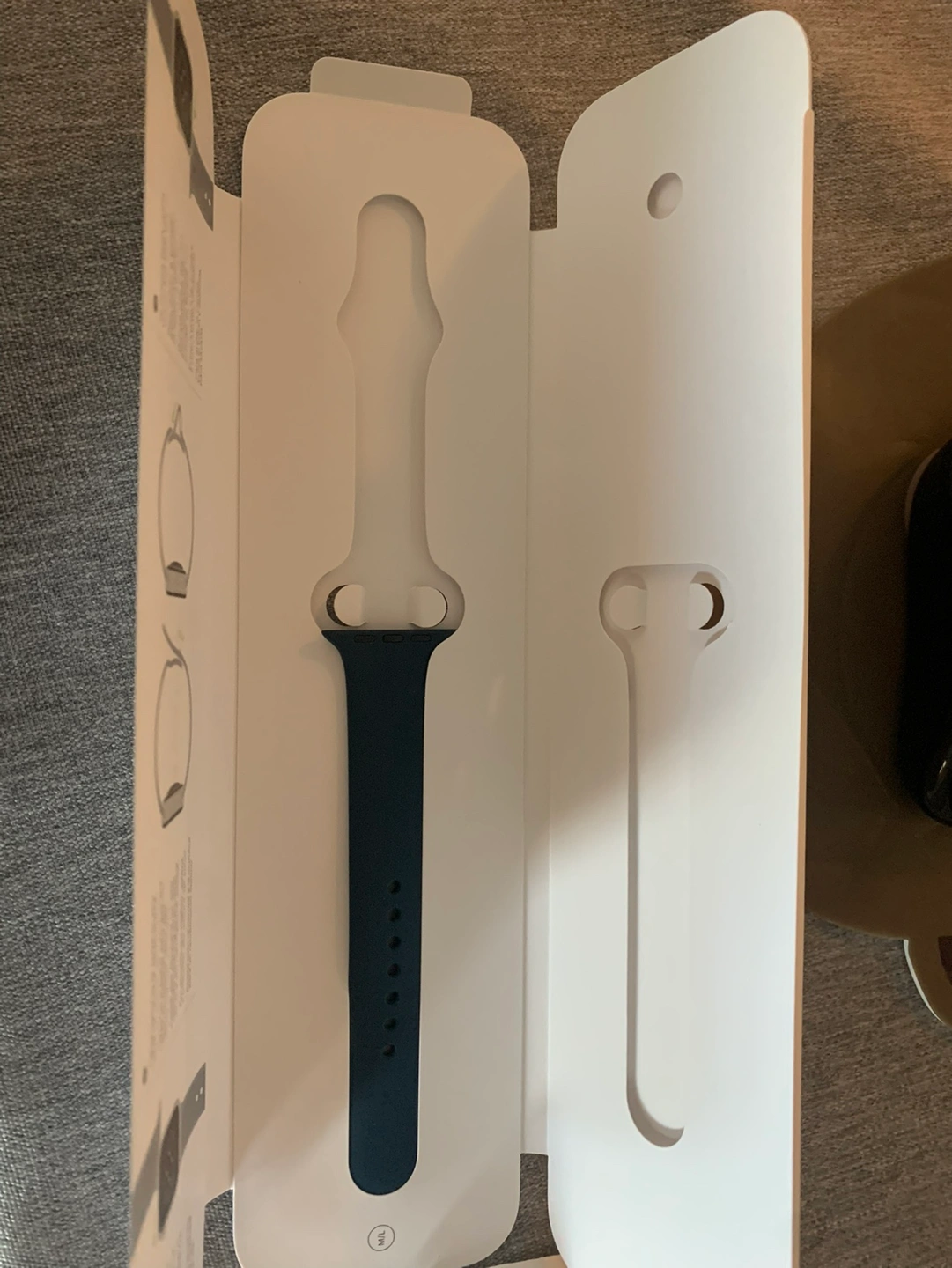 This is a brand new Apple Watch Sport Band. It has never been worn. It comes in the original packaging. It is a medium size. It is blue in colour. Pick it up near Richmond Centre