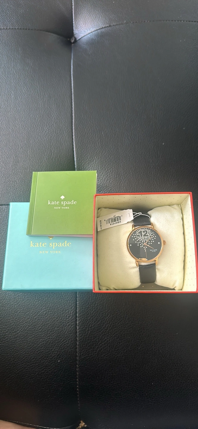 This is a Kate Spade New York Women's Watch. The watch has a black leather band with a rose gold case and a black face. It comes with the original box. MATERIAL shiny rose gold plated metal with leather strap FEATURES black enamel dial champagne bottle at 6 o'clock mark water resistant Style No. KSW1014 New in packaging Little champagne bottle inside is loose Needs new battery Retails for $270+ tax, selling for $120
