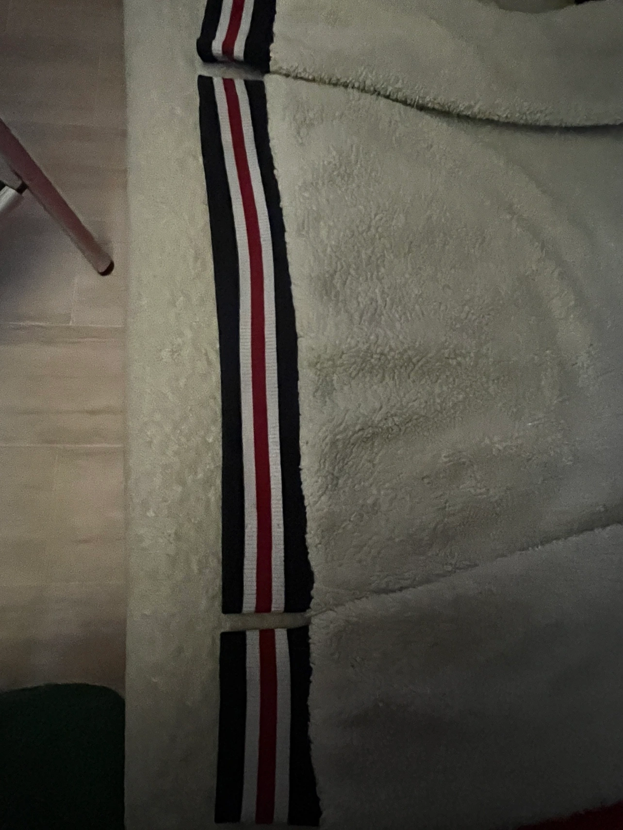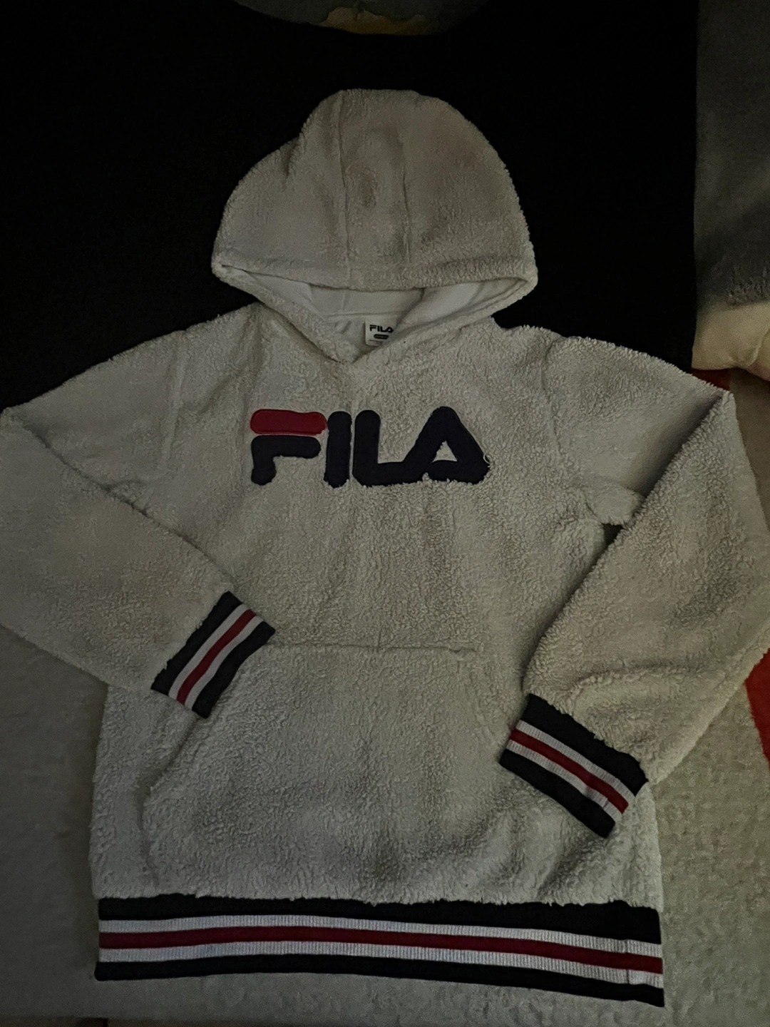 White Fila hoodie with red, white and blue detailing. Size L/G (10/12). The hoodie has a kangaroo pocket and a lined hood.