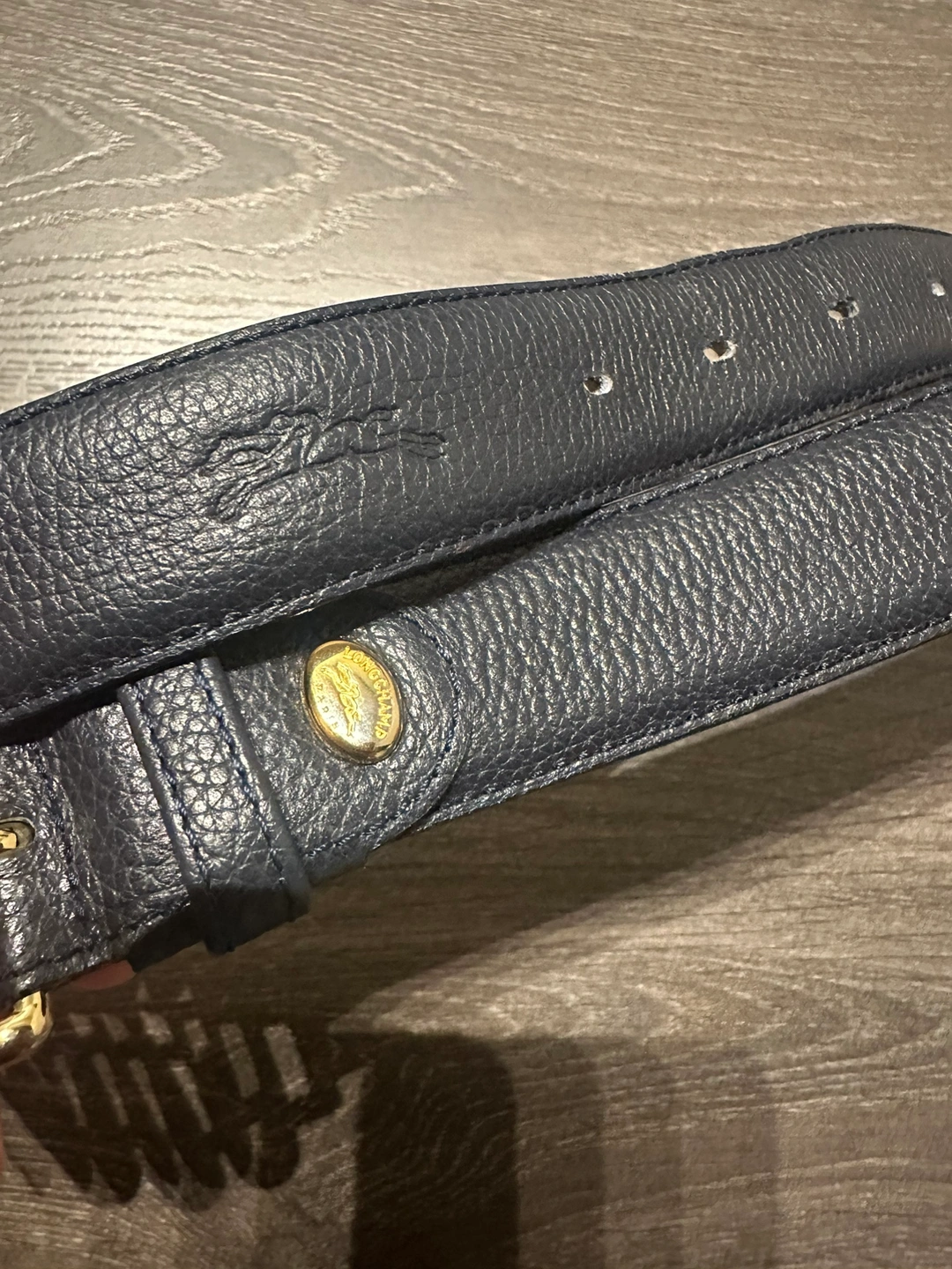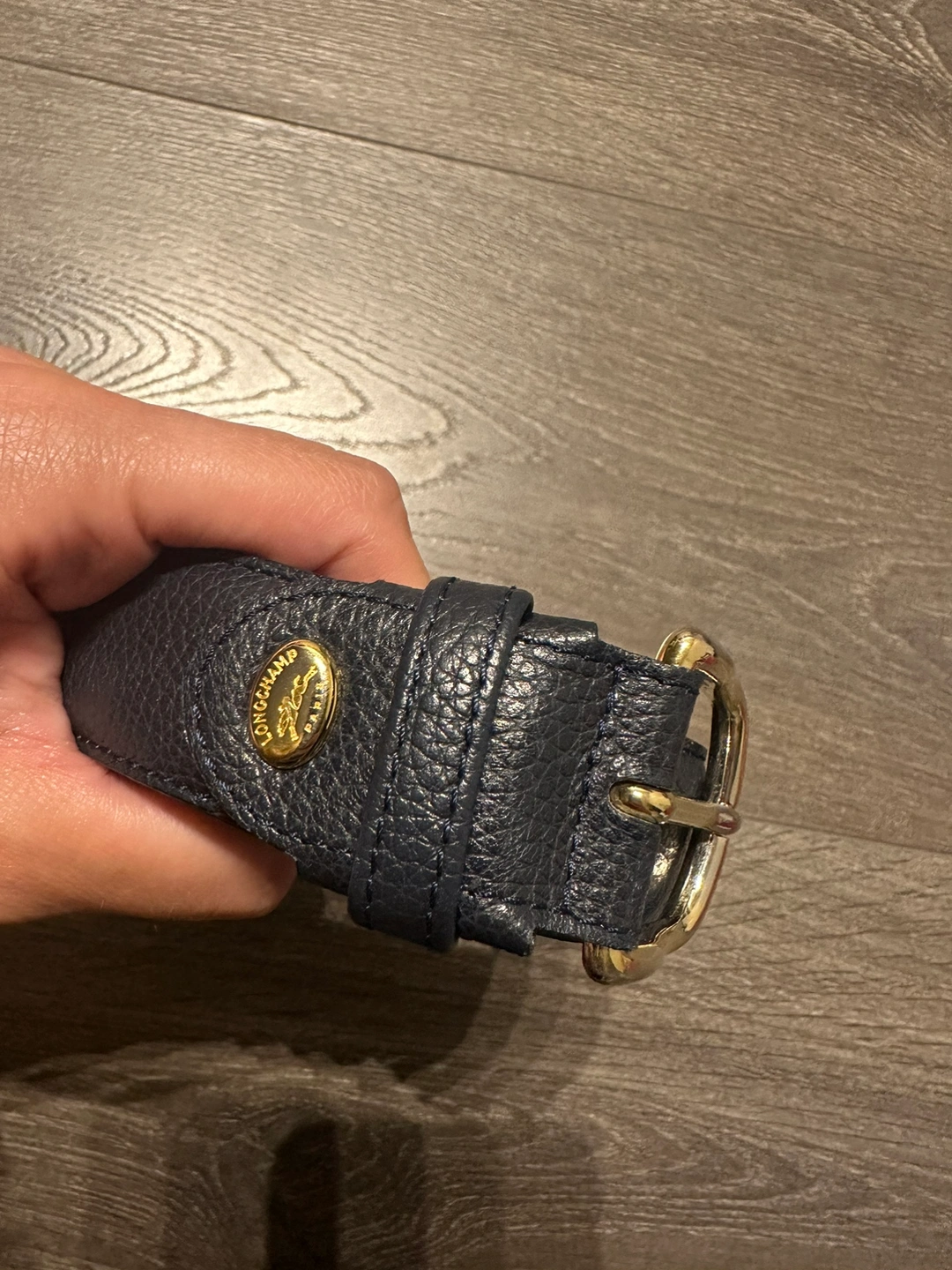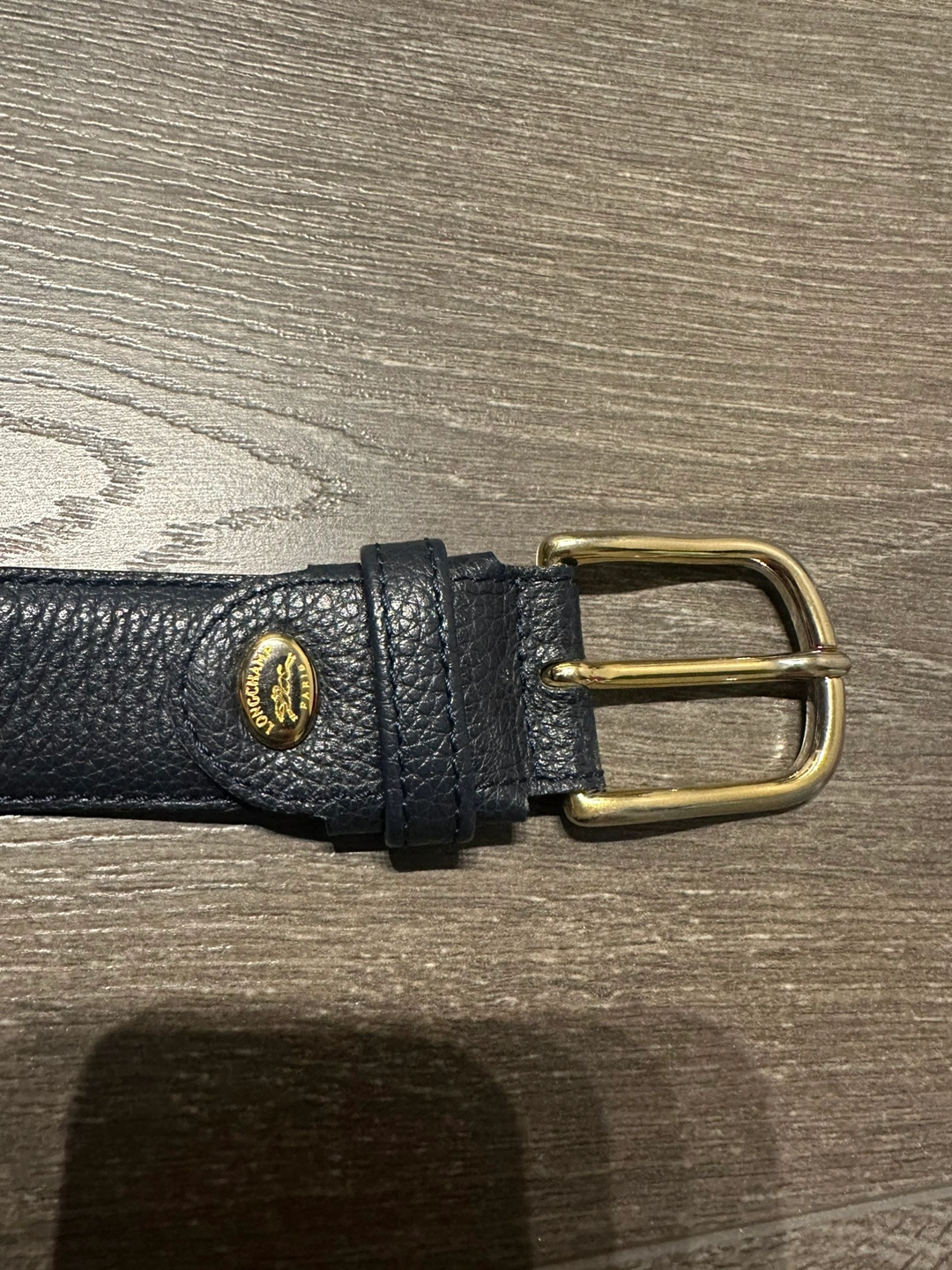 Longchamp dark blue leather belt with a gold buckle. The belt is 3cm wide. Length 100cm - distance to first hole : 92cm - distance to last hole - 82cm Great pre owned condition