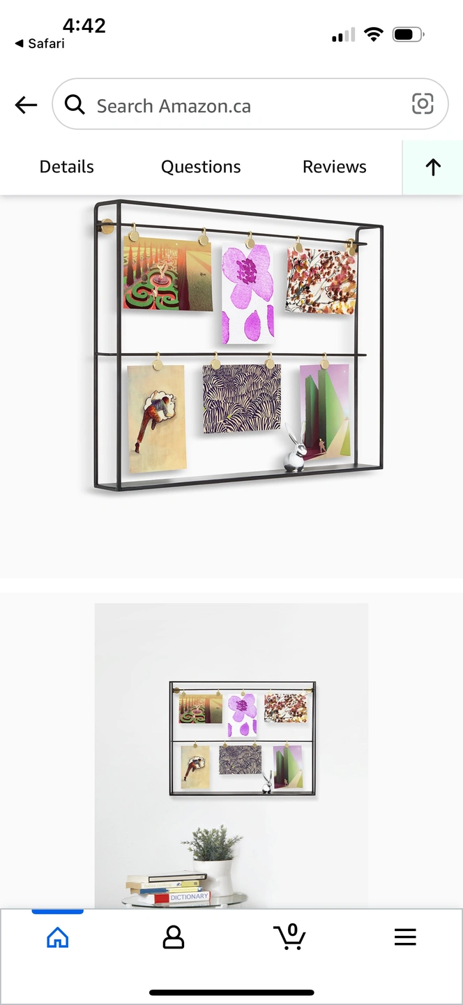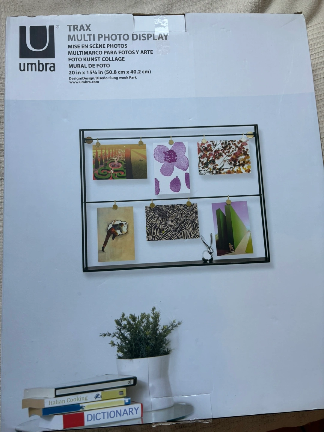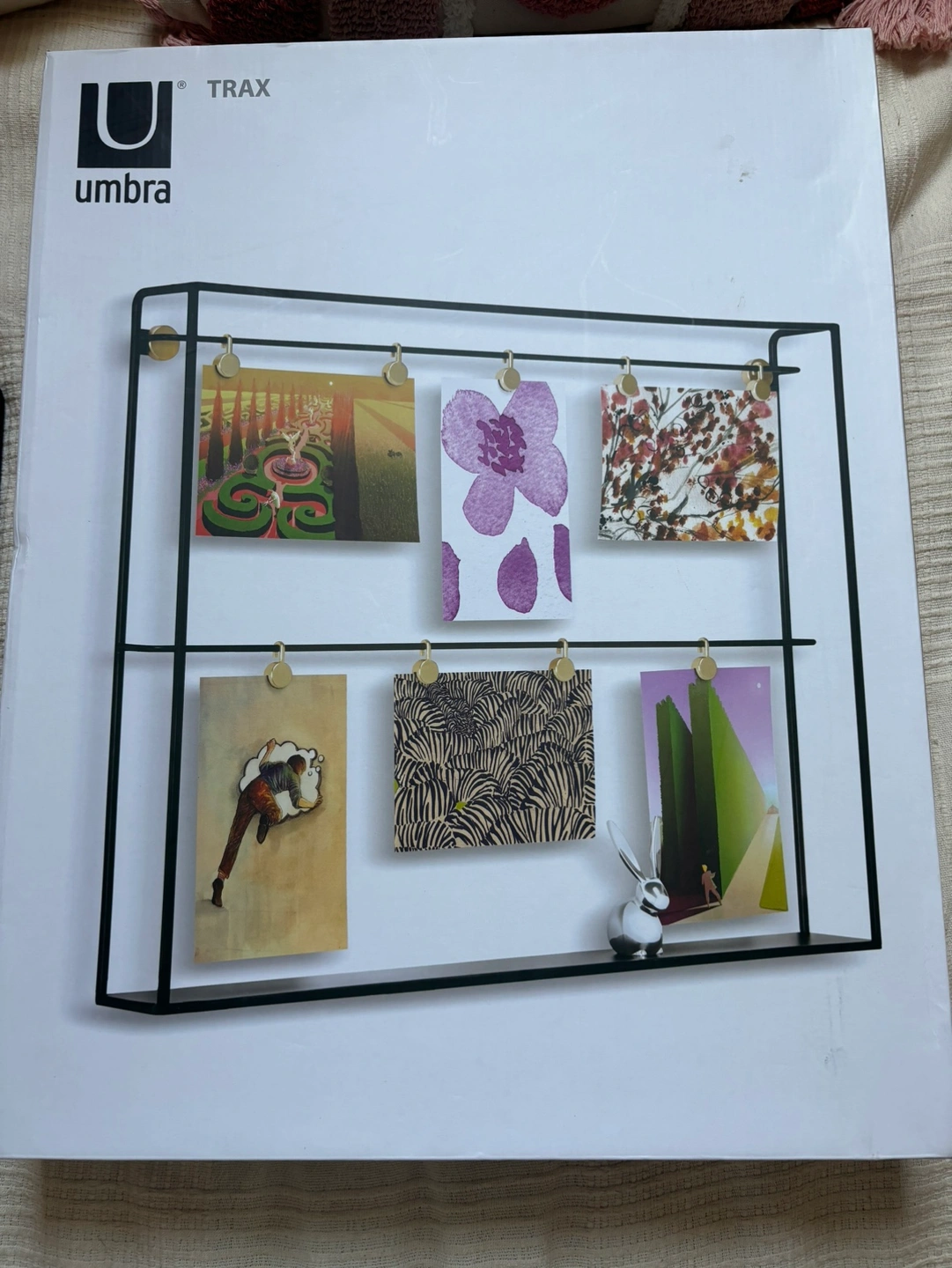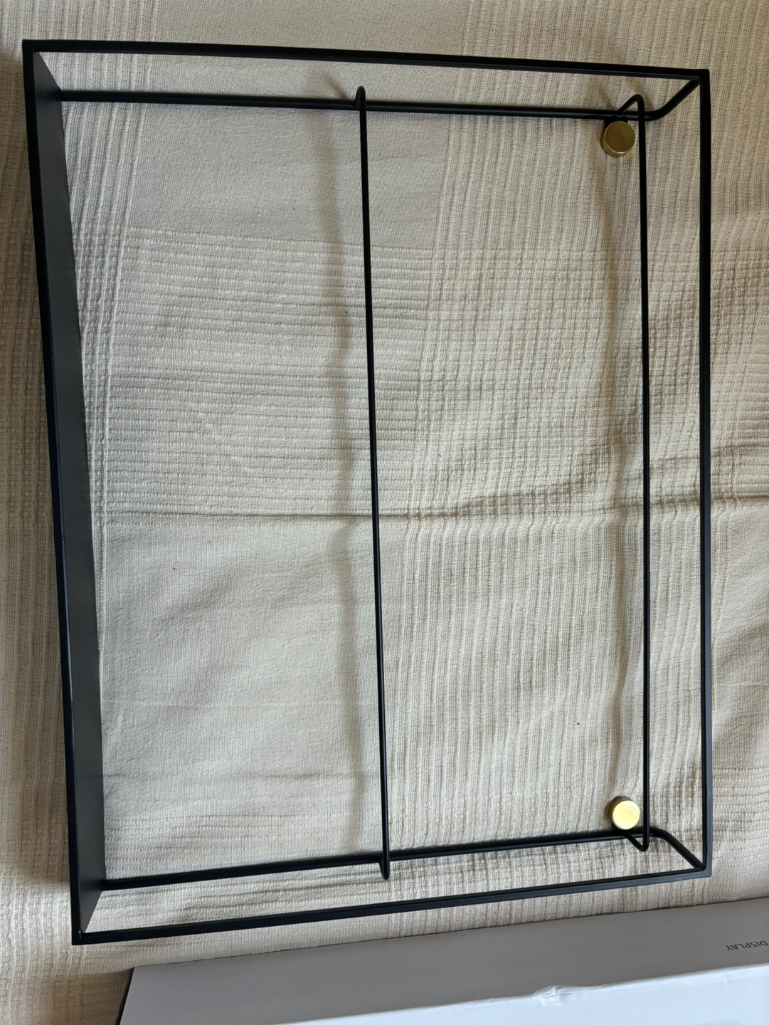 Black metal photo display with gold clips. Holds up to six photos, It includes two horizontal bars for displaying photos. It is approximately 16.8" x 40.2 cm.