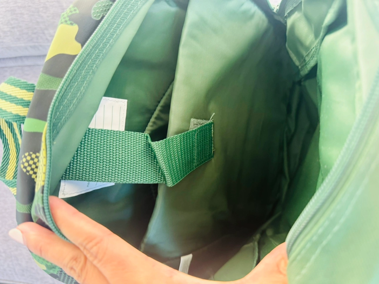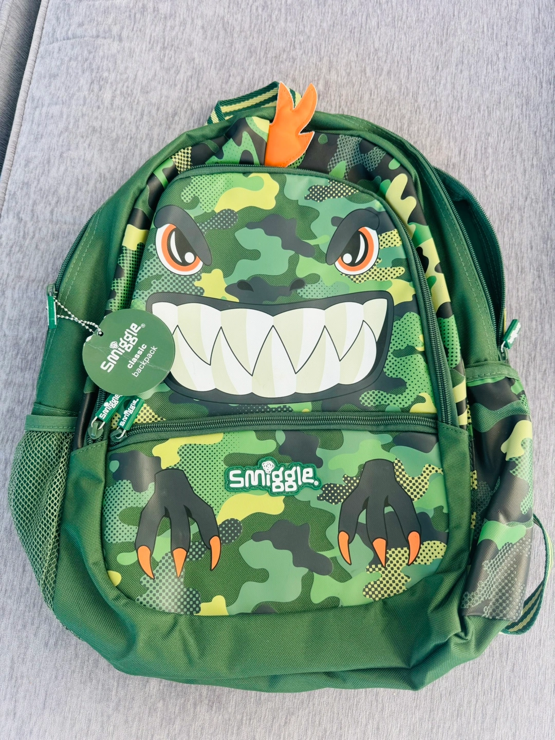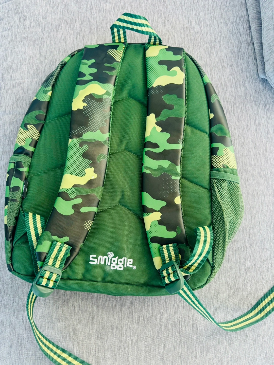 Green camouflage backpack featuring a monster face . It has a zippered main compartment, a front pocket, and side pockets. It also features adjustable straps and a carrying handle. And very lightweight bag.