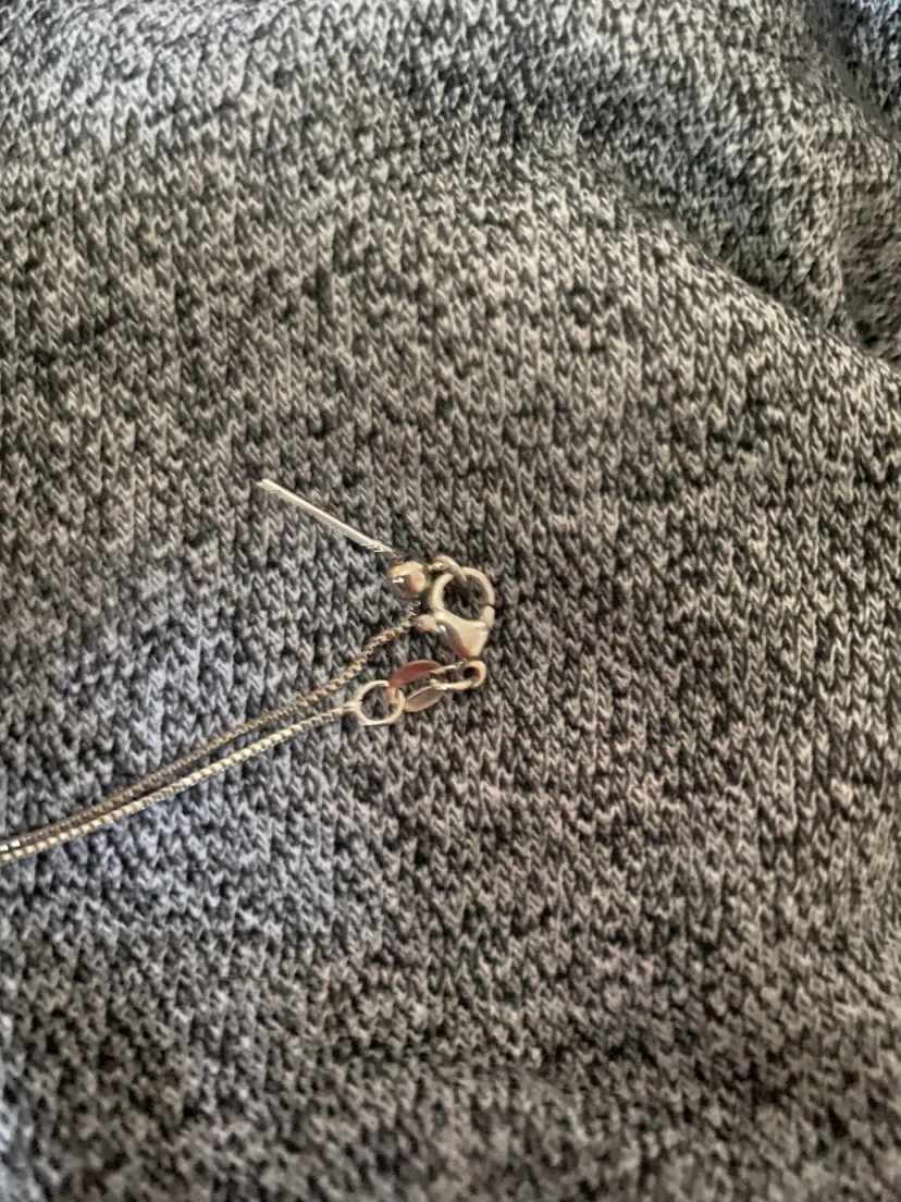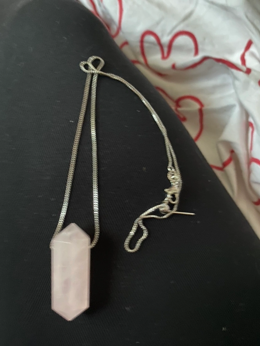 Silver toned chain with a double terminated rose quartz pendant.