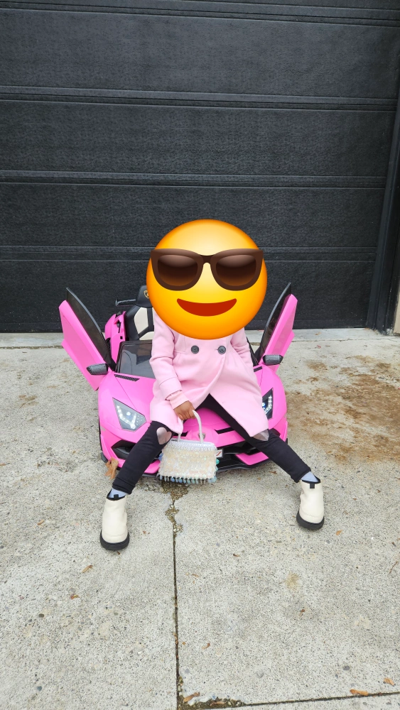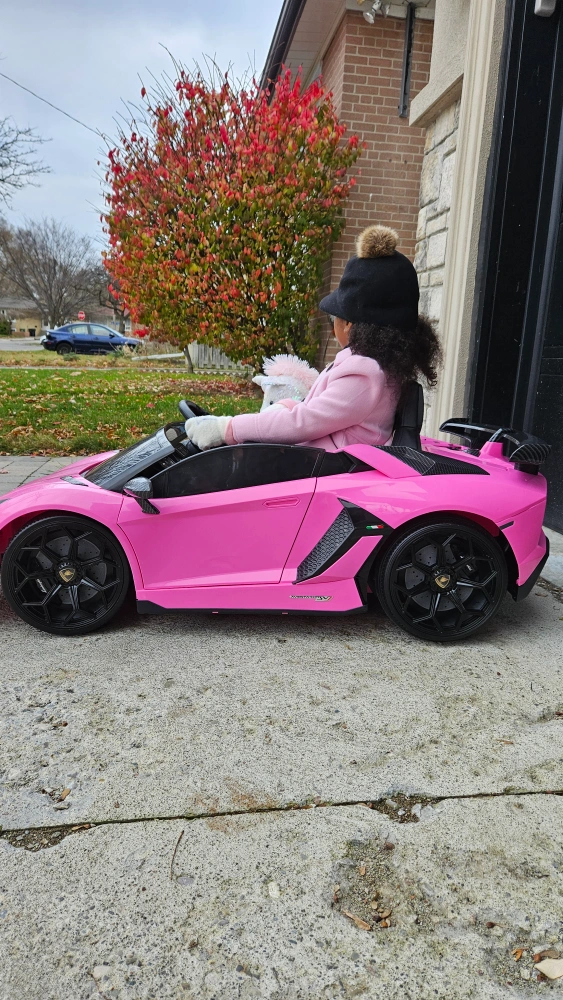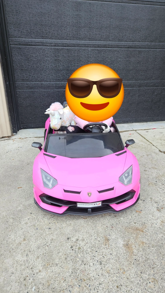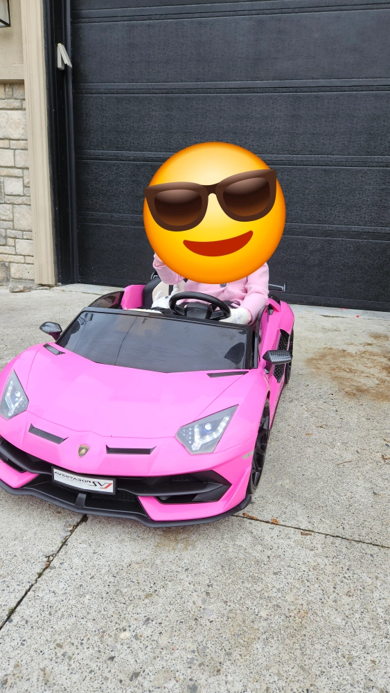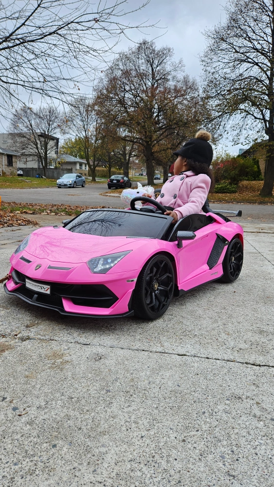 A pink kids ride on car that looks like a Lamborghini. It has working doors and lights. It's a great way for kids to have fun while learning about cars. It comes with a charger and a remote control.