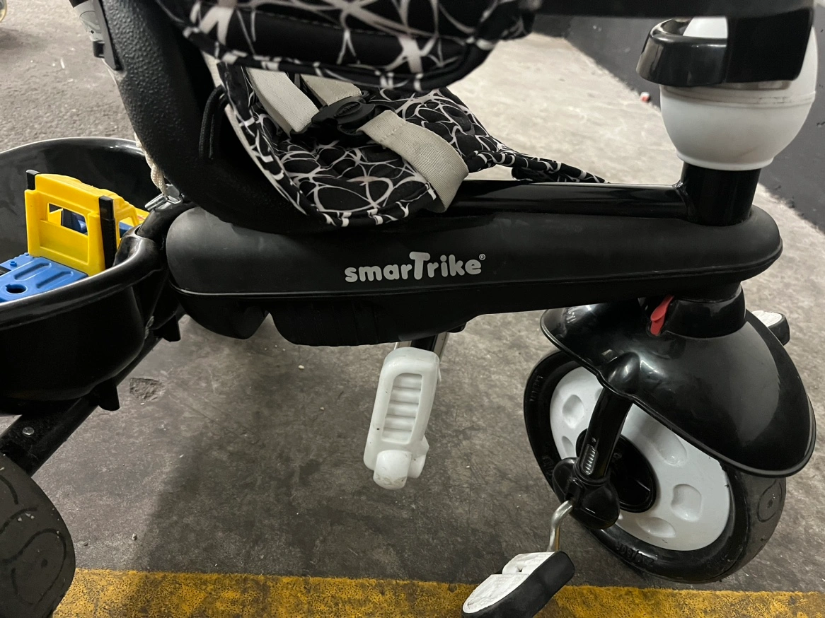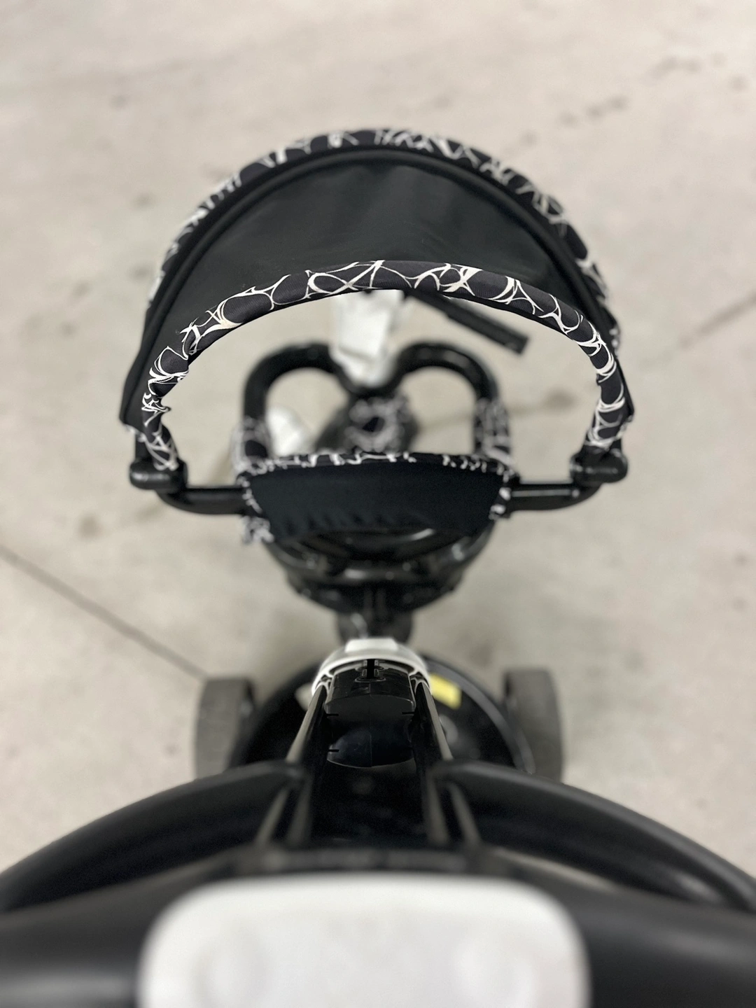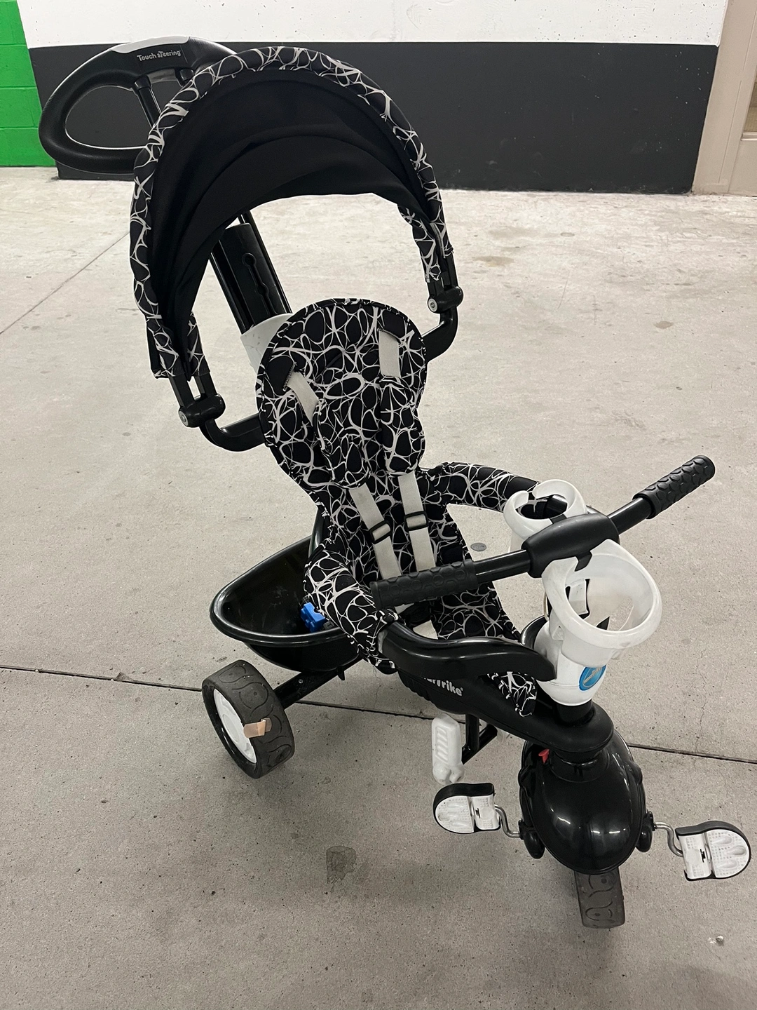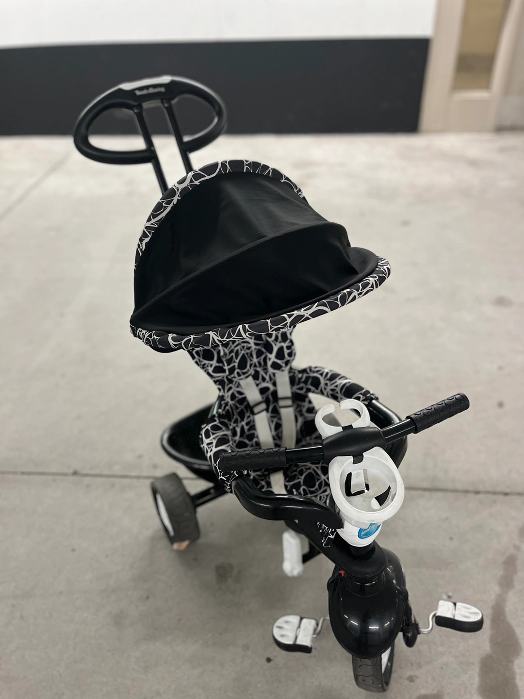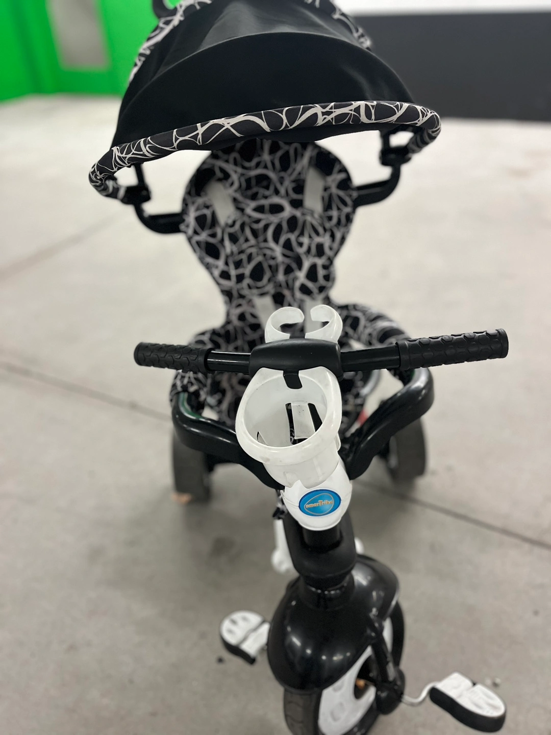 This is a kids' tricycle with a removable canopy and a storage basket. It has a black and white pattern. It has two cup holders for drinks. Can be used for kids 10 months to 3 years old Pet free/smoke free home