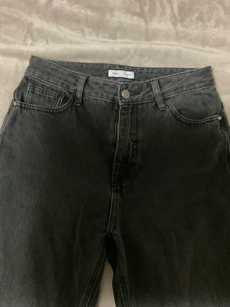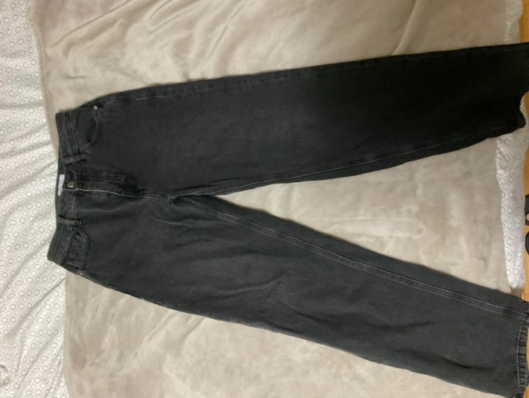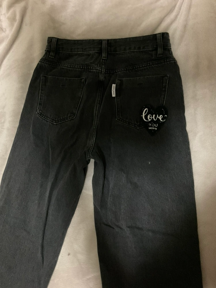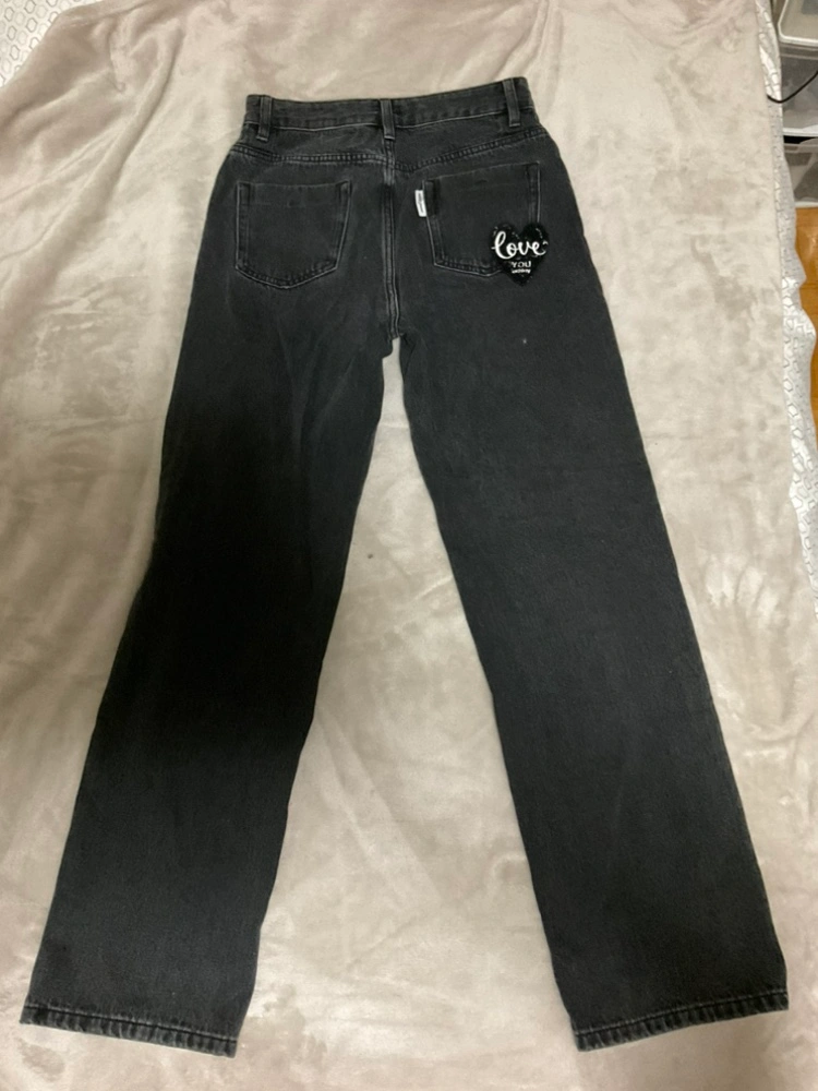 Black straight leg jeans with a "Love You" patch on the back pocket.