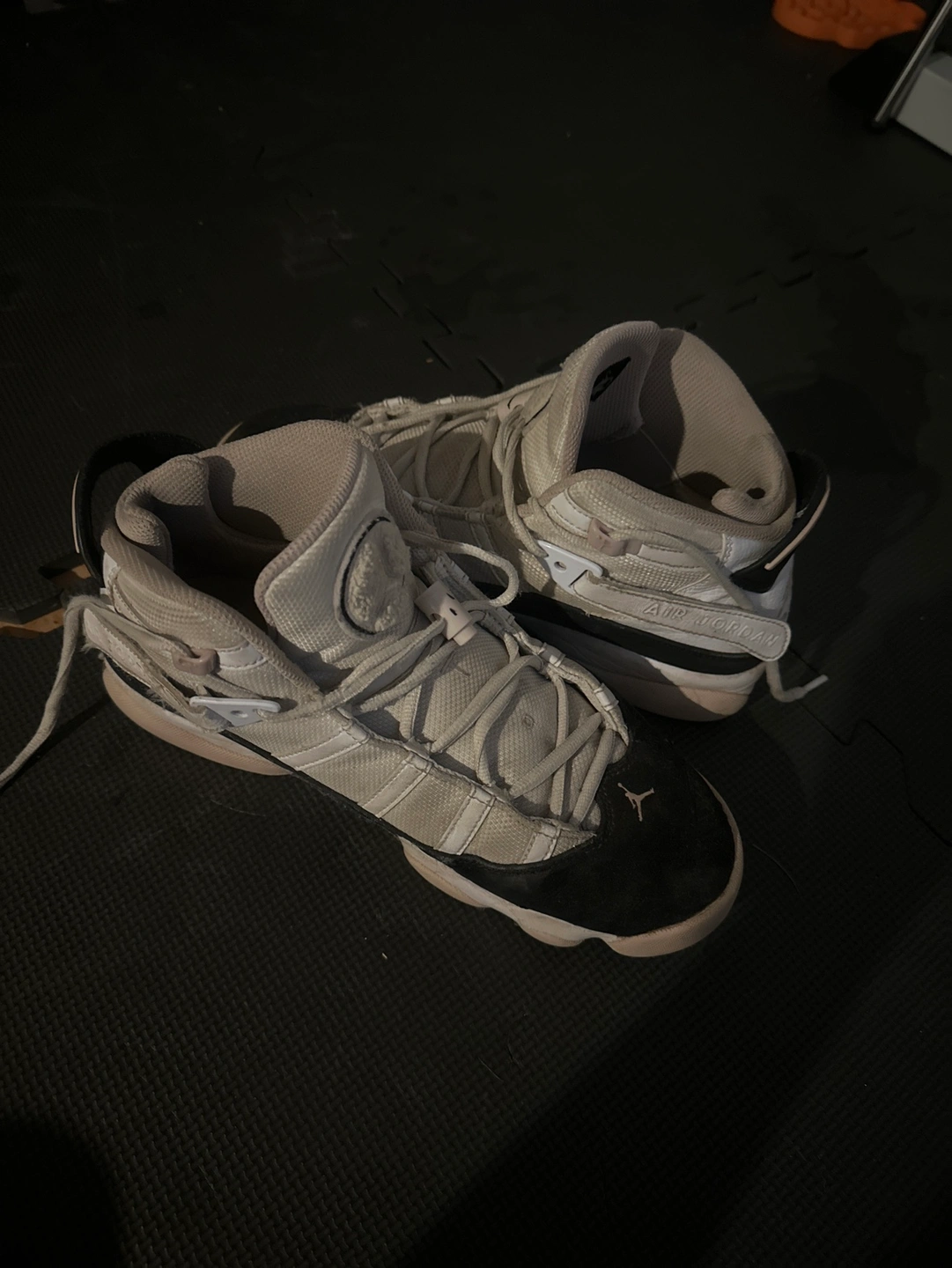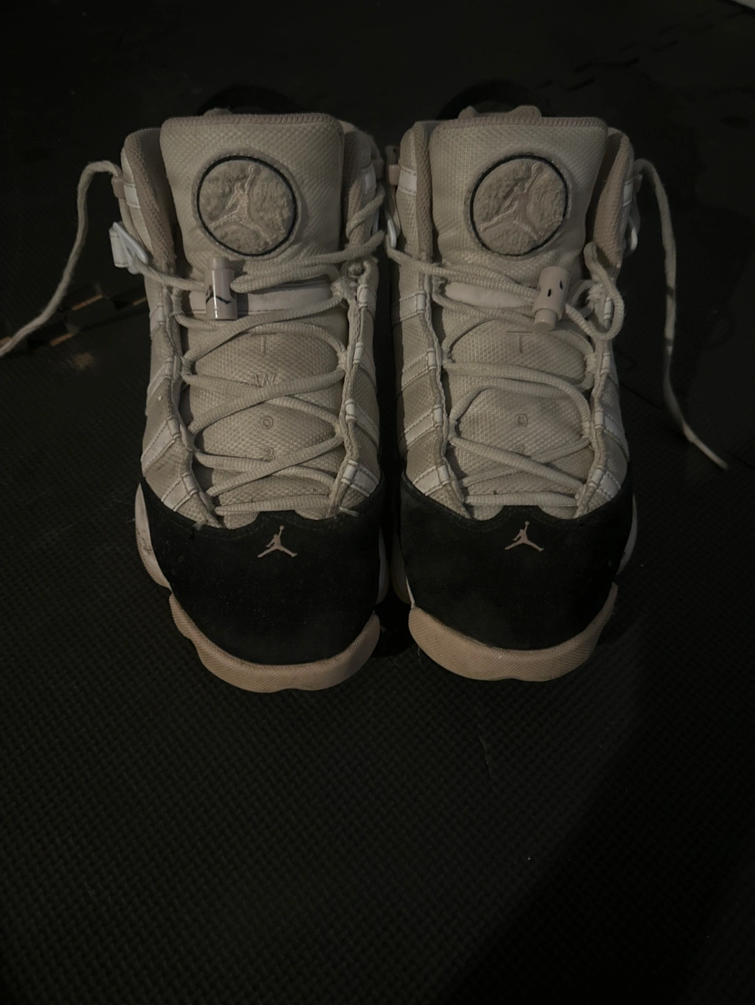 These are men's size 8.5 Air Jordan 6 Retro sneakers in the colour "White/Black/beige". They have been worn and have some signs of wear.