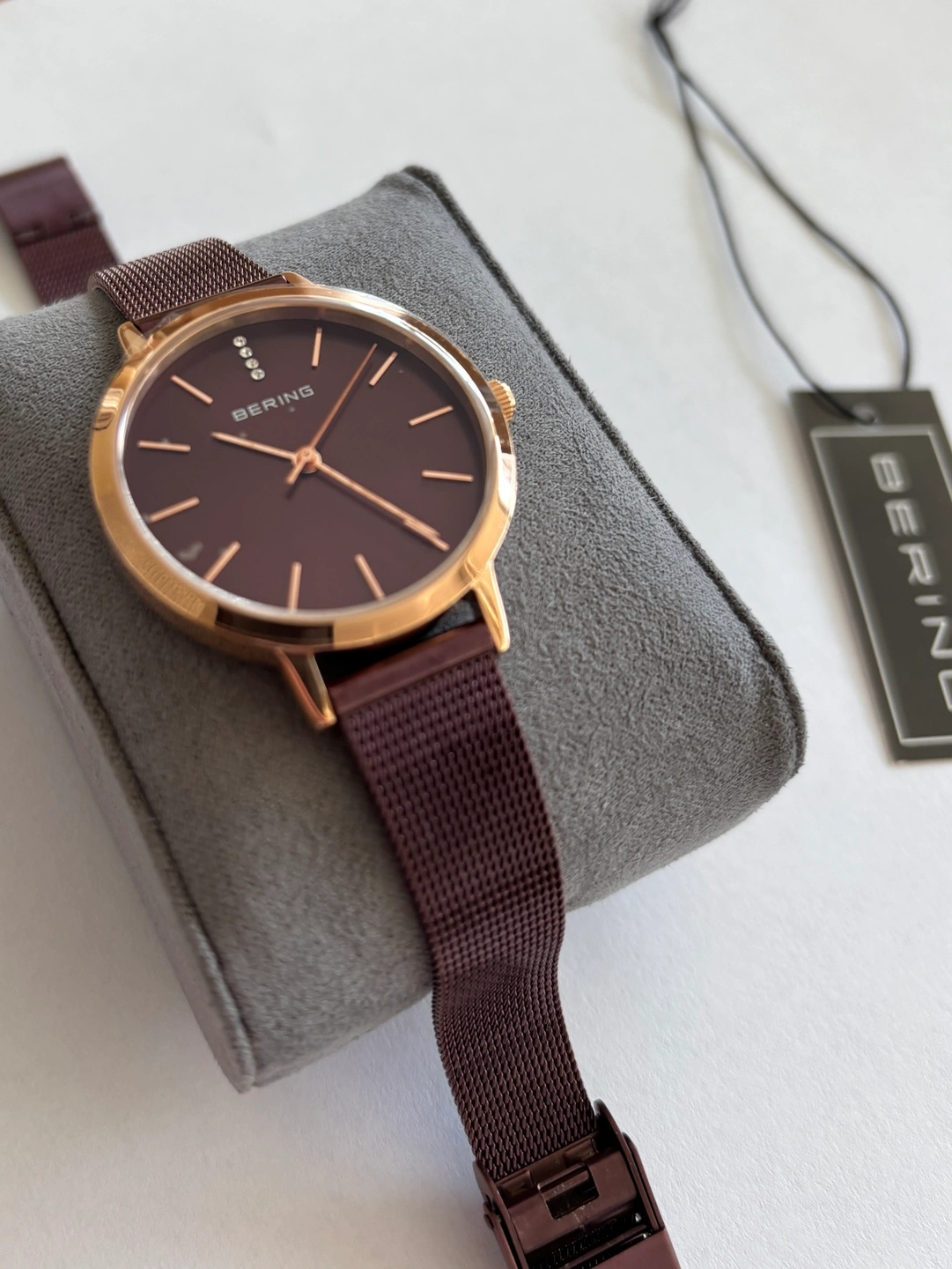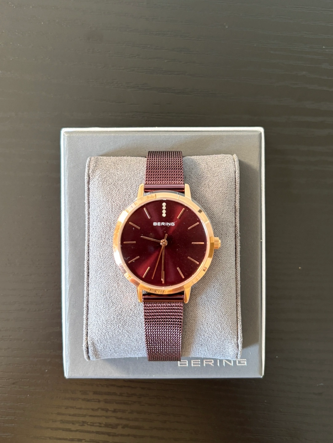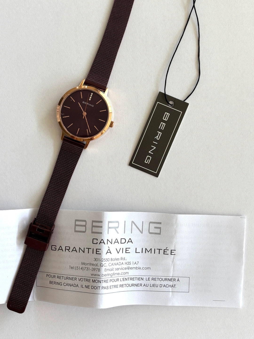 Brown Bering Women's Classic Watch 13434-265 Burgundy face with a rose gold finish and adjustable burgundy mesh band + original box and lifetime limited warranty. Cash only. Pick up at RBC Bathurst and Sheppard. I’m available to answer any questions :)
