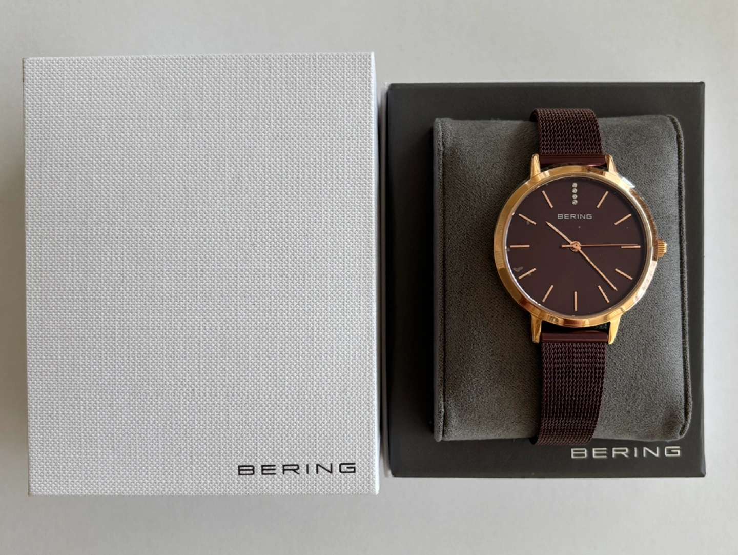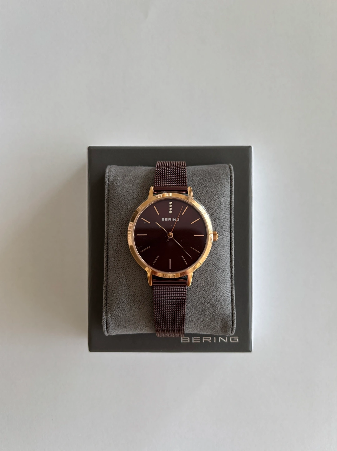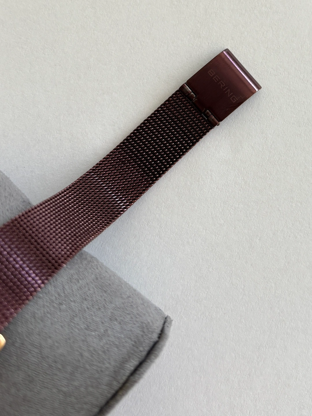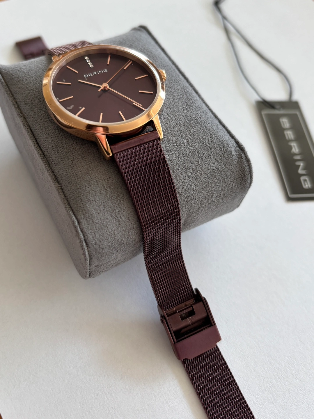 Brown Bering Women's Classic Watch 13434-265 Burgundy face with a rose gold finish and adjustable burgundy mesh band + original box and lifetime limited warranty. Cash only. Pick up at RBC Bathurst and Sheppard. I’m available to answer any questions :)