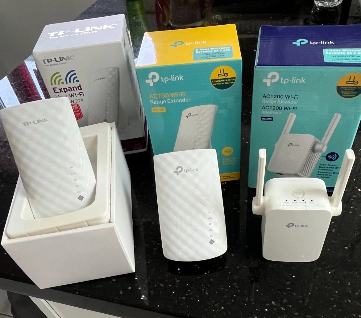 This is a TP-Link AC750 Wi-Fi Range Extender in the original box. It comes with the extender and a quick start guide. Almost new. $20 each.