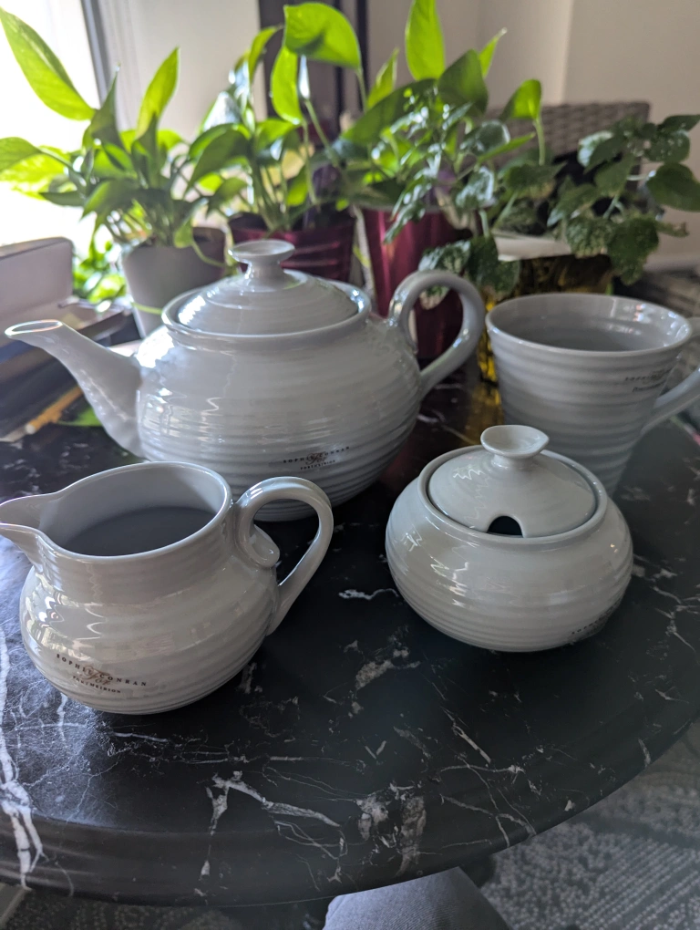 Sophie Conran Tea Set, from the Port Meirion Collection. This set consists of, teapot, creamer , sugar bowl and 2 mugs. The set in grey. Brand new.