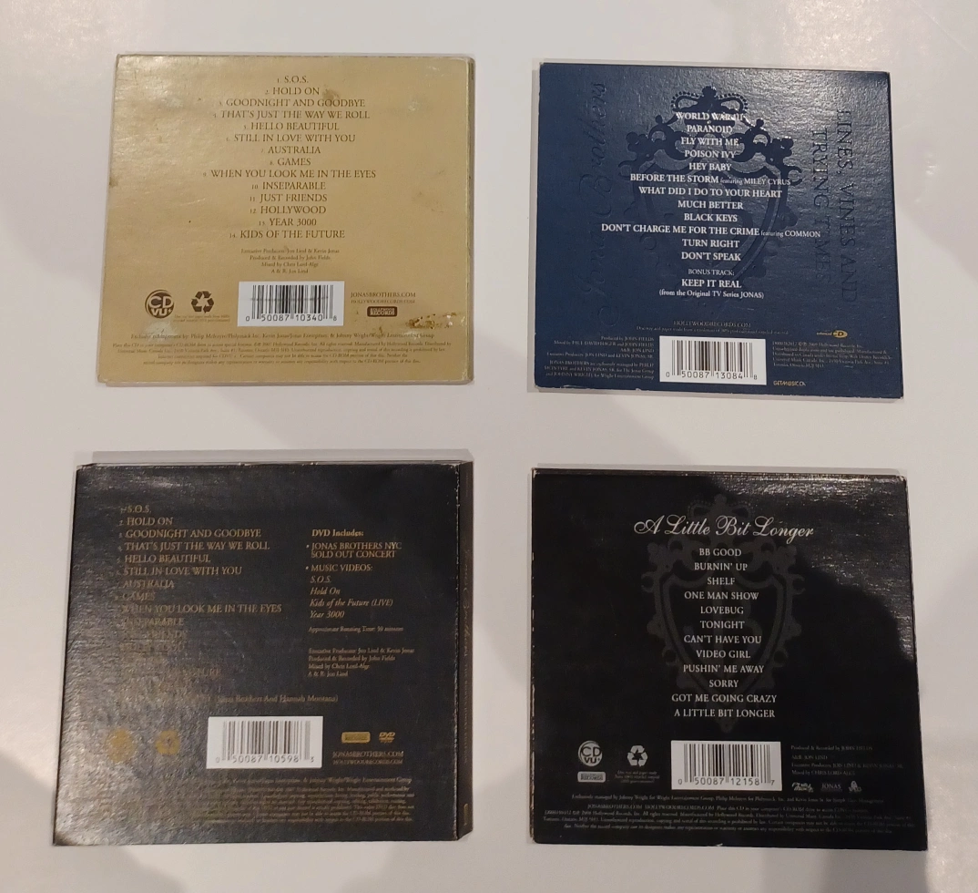 Selling 4 Jonas Brothers CDs: 'Jonas Brothers', 'Lines, Vines and Trying Times', 'Jonas Brothers The Bonus Jonas Edition', and 'A Little Bit Longer'. $5 each, or take all for $10. Played many years ago well, haven't tested recently. Please see images for condition. ****PLEASE NOTE: If condition is make or break for you, please reconsider purchasing. These are priced to sell. I am unable to meet only for you to review them. That is what the photos provided are for. Serious inquires only. Thank you for your understanding. The 'Jonas Brothers' self-titled album has some stains on the back of the case, as well as minor scratches and fingerprints on the disc. May be some minor scratches and fingerprints on the others, but overall good shape. Available for pick up in Etobicoke. If you're interested please message me and I can send you the full address. Thank you for reading :) Check out my other listings for more collectibles, buy multiple and get a great deal!