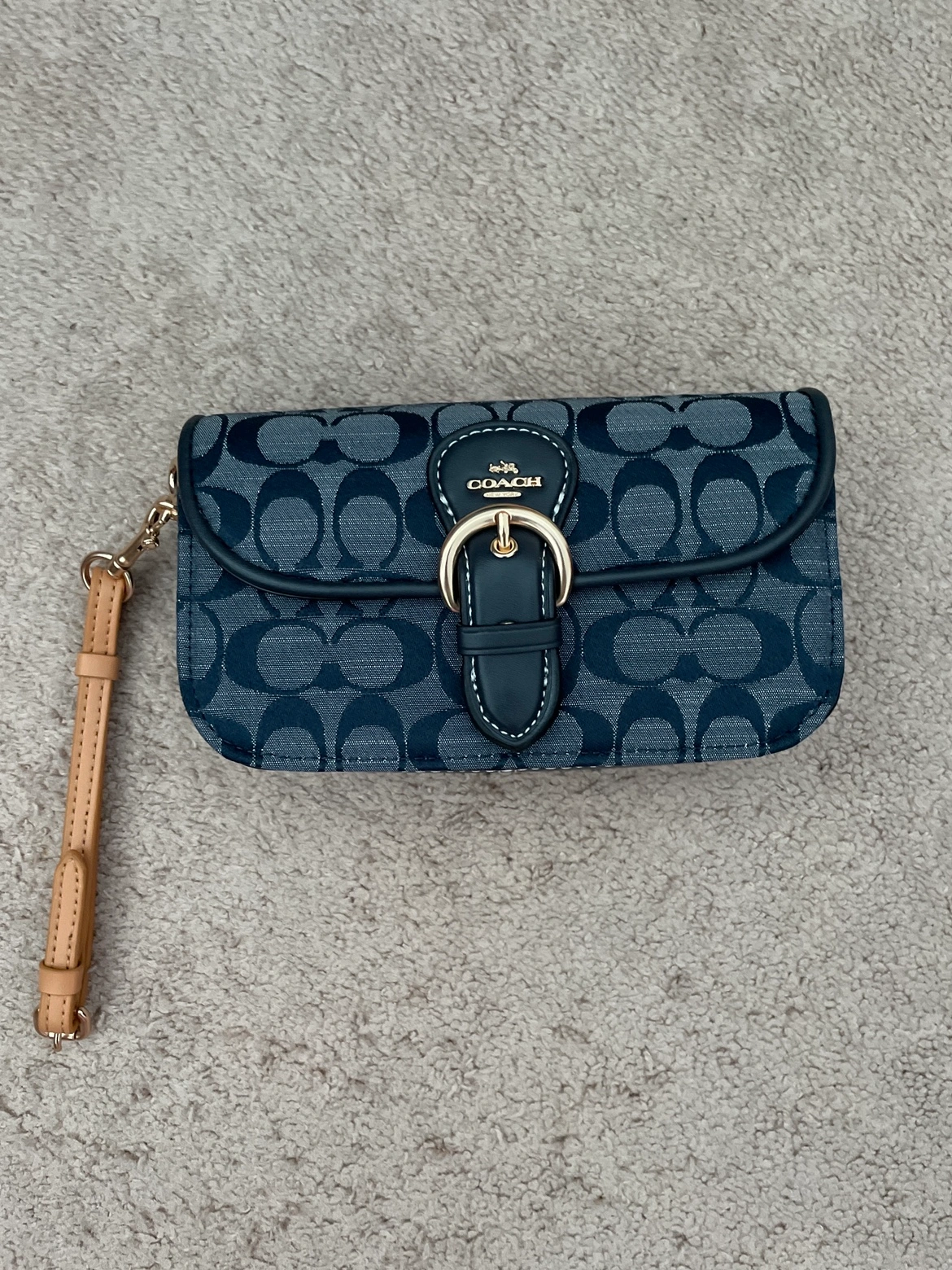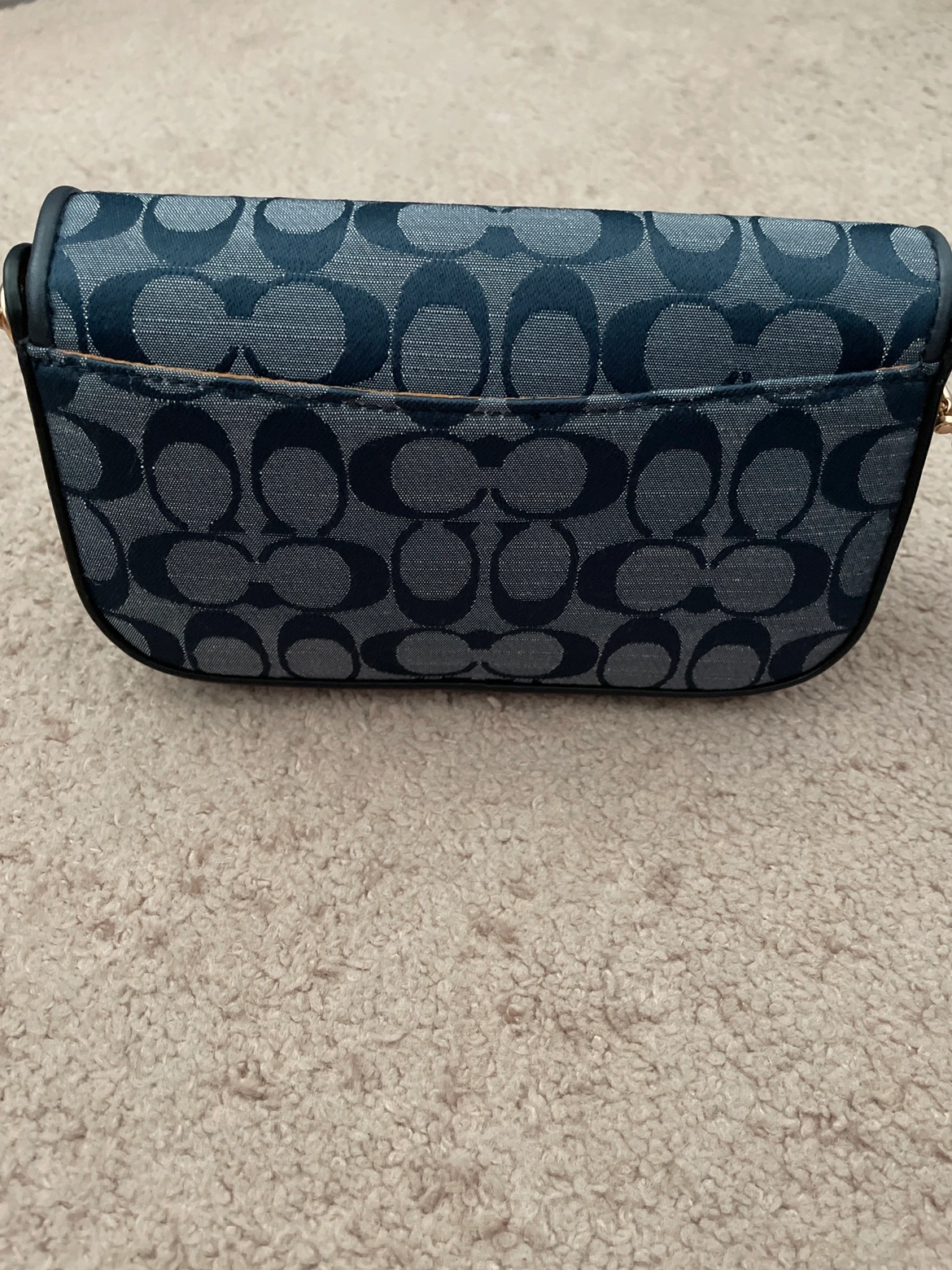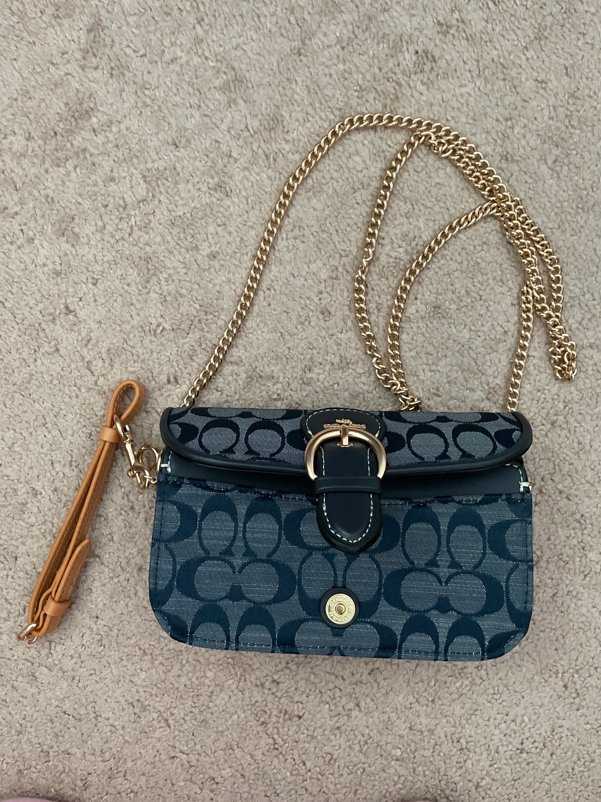 Small blue Coach bag with a gold chain strap and brown leather wrist strap. The bag has a magnetic buckle closure. It is a great size for everyday use. Best offers and price is negotiable.