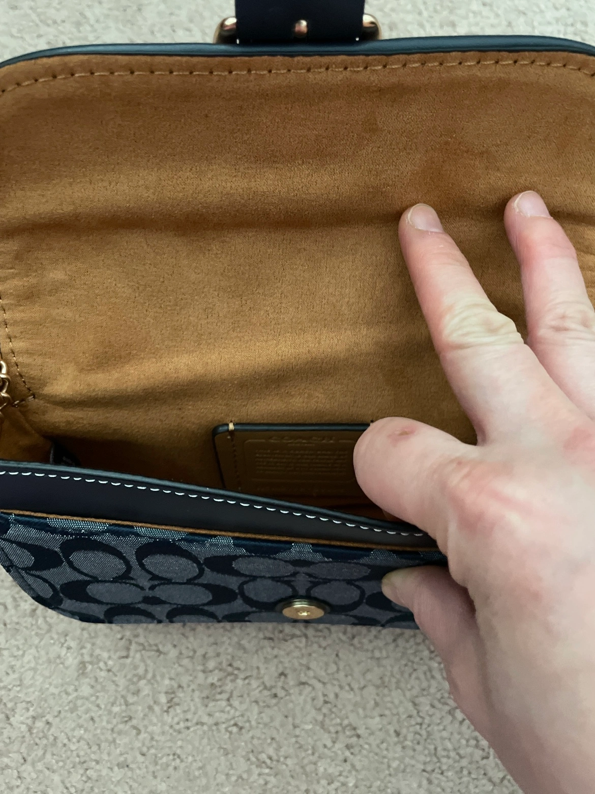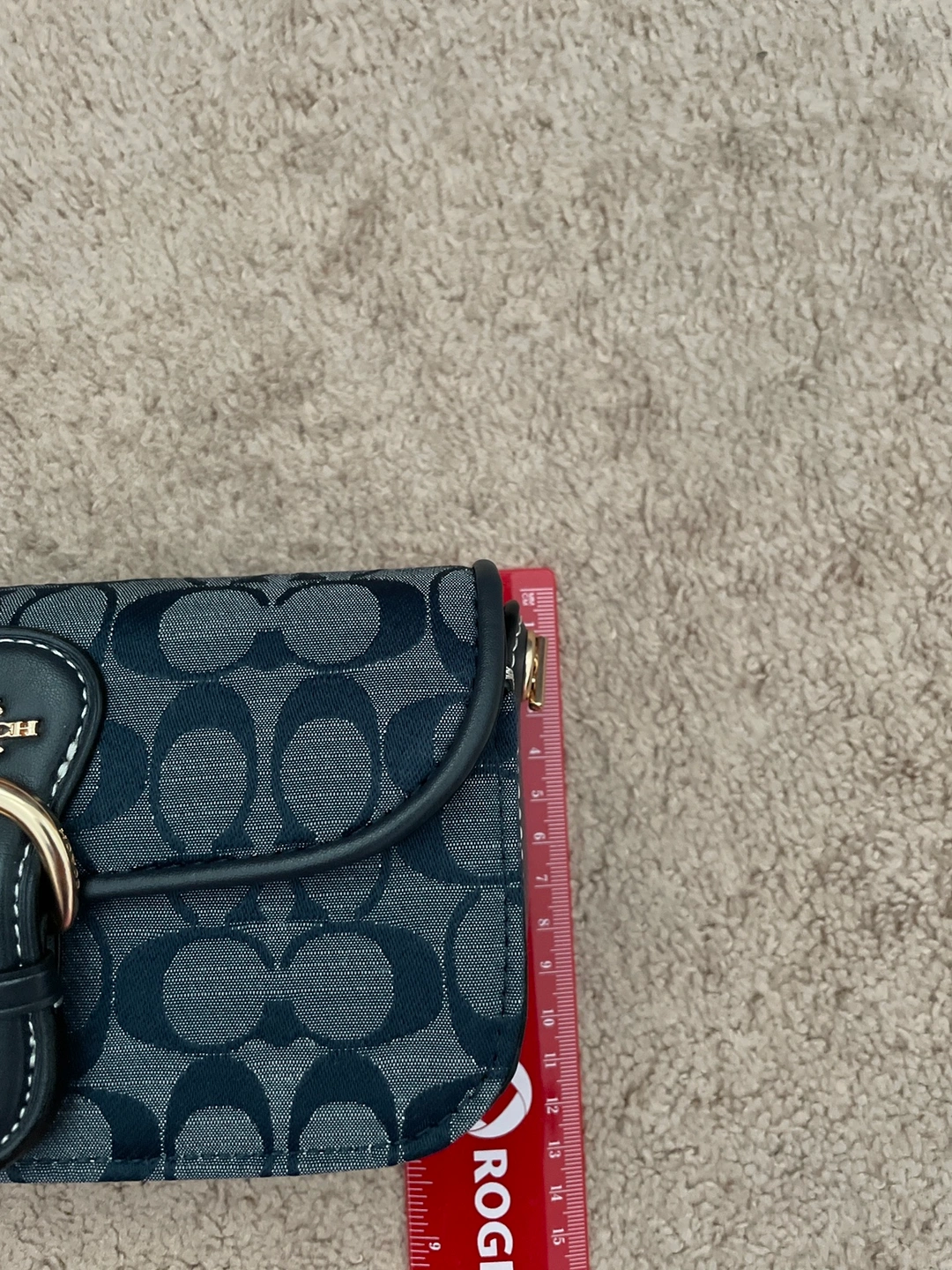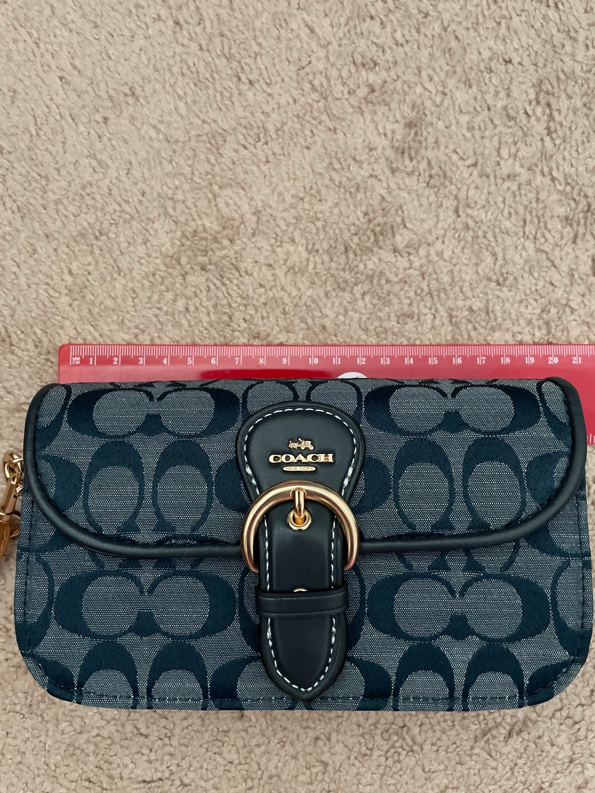 Small blue Coach bag with a gold chain strap and brown leather wrist strap. The bag has a magnetic buckle closure. It is a great size for everyday use. Best offers and price is negotiable.