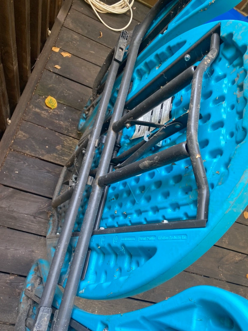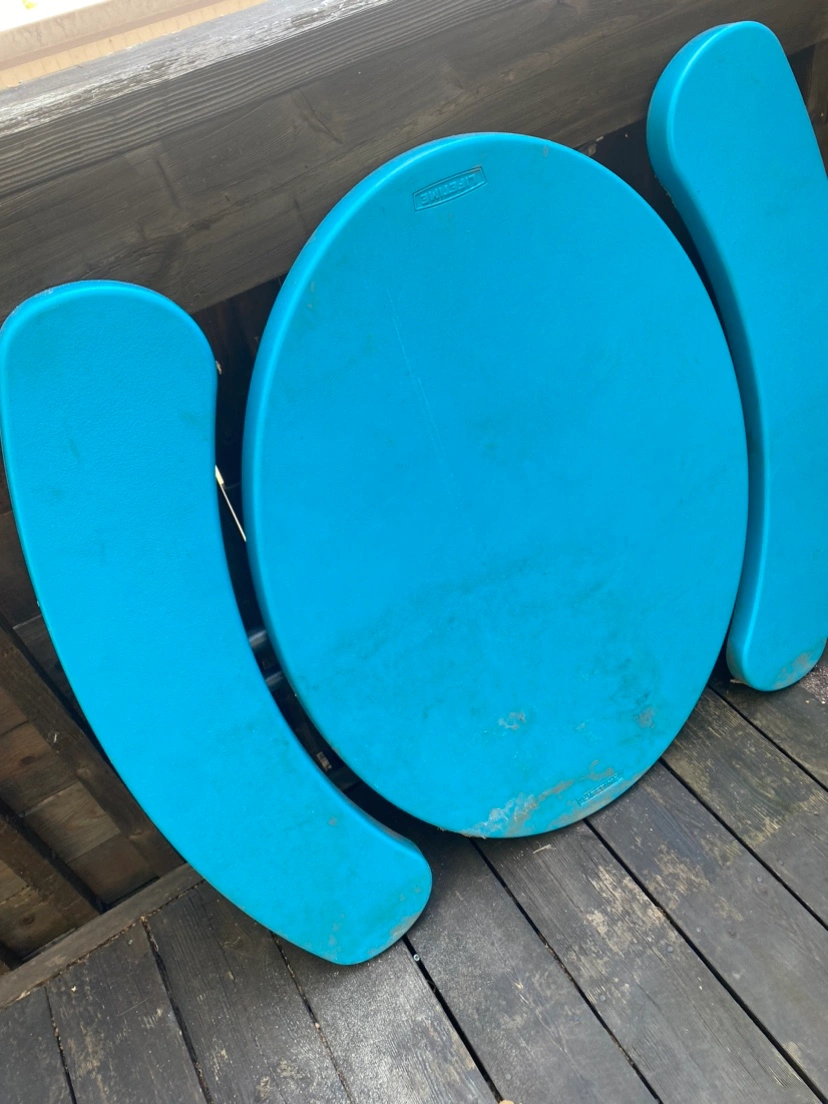 Folding children’s picnic table. Set includes a round table and seating for four small kids all in a bright blue colour. Foldable for easy storage