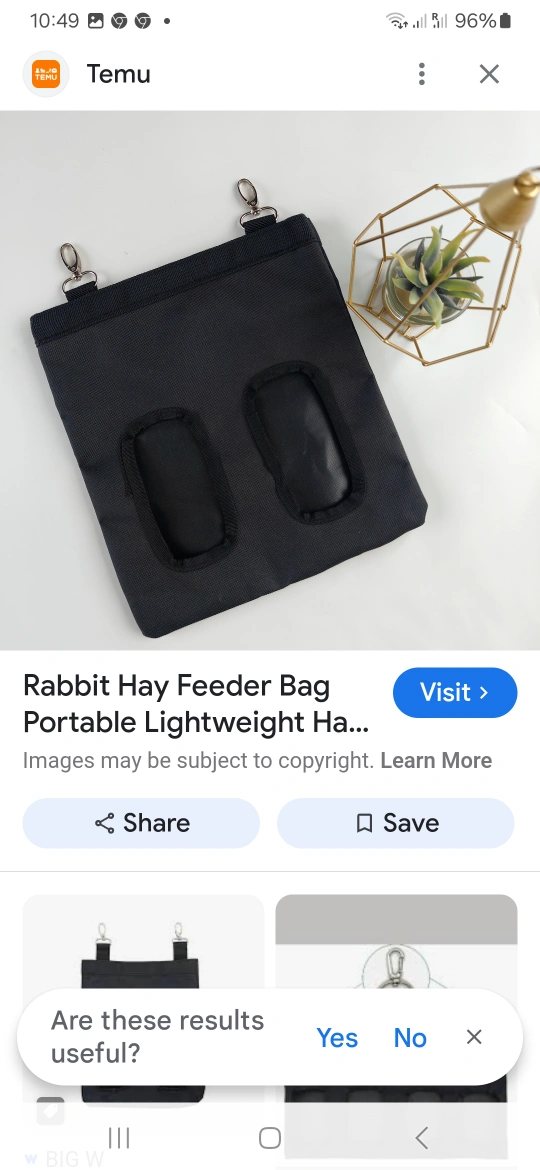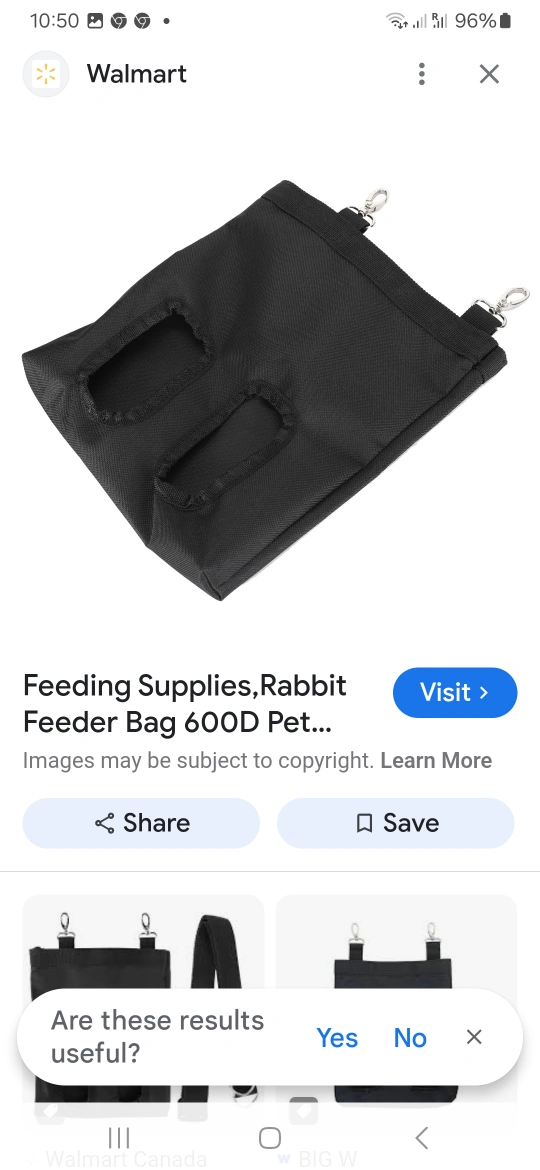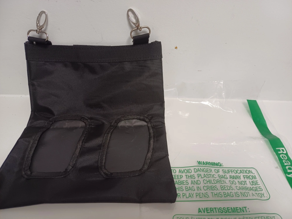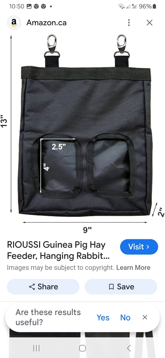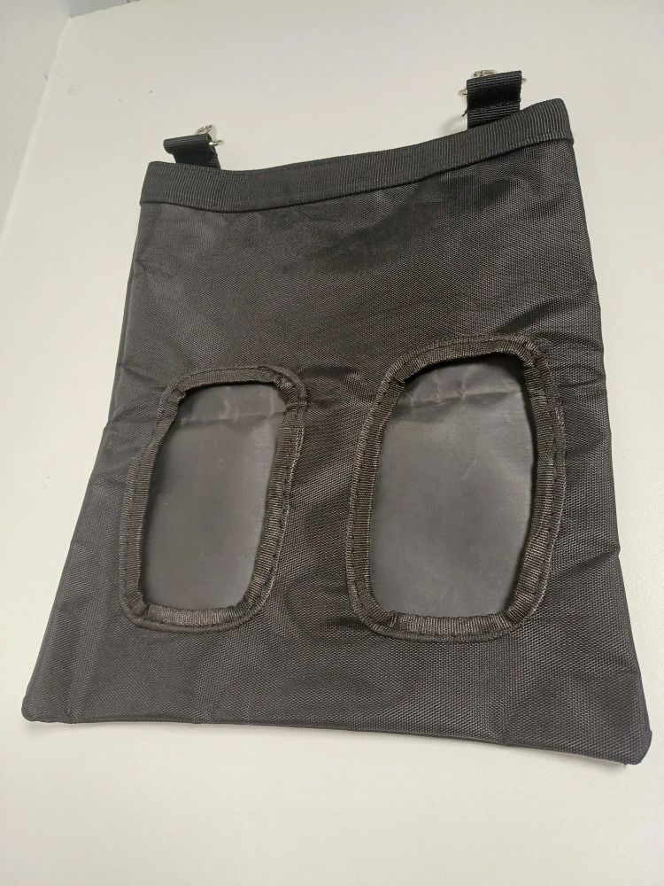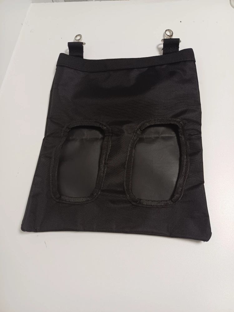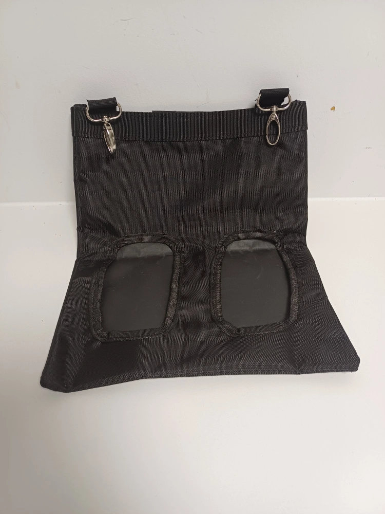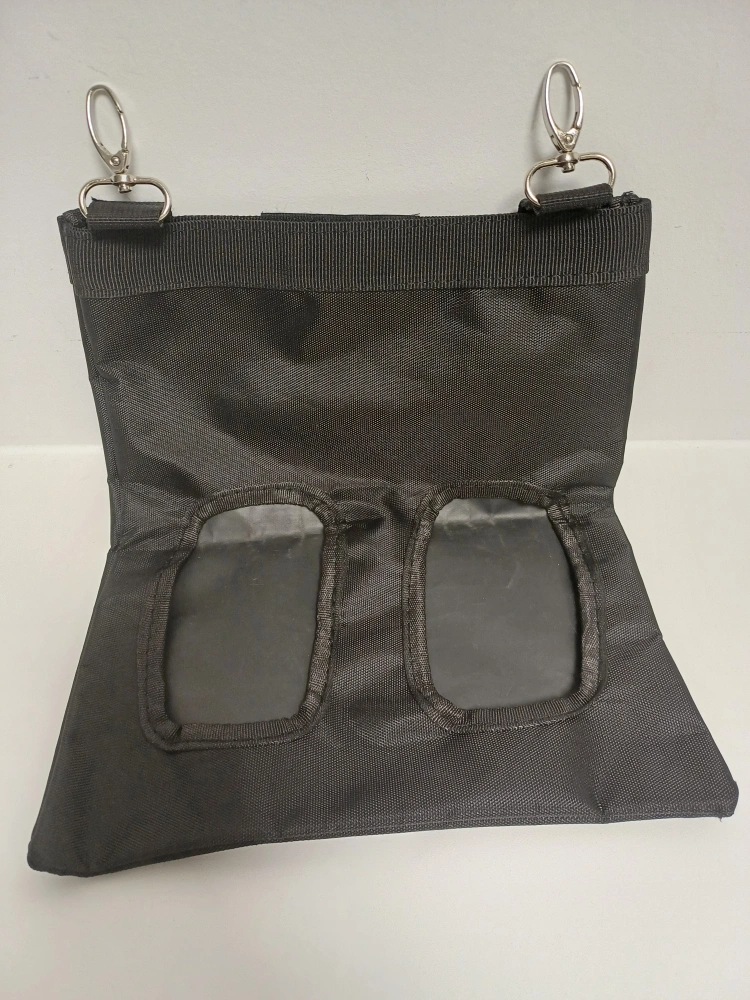 Black hanging hay feeder pouch/bag for rabbits with two openings. It has two clips for hanging. Brand new/never been used Try itππ