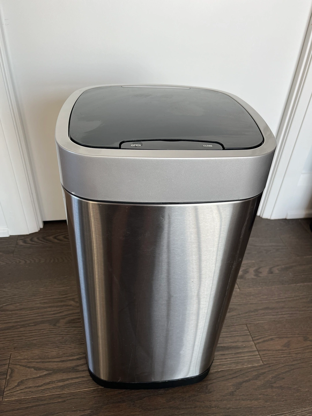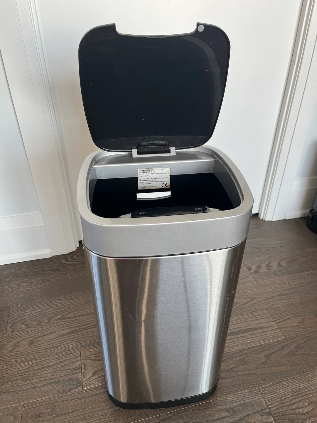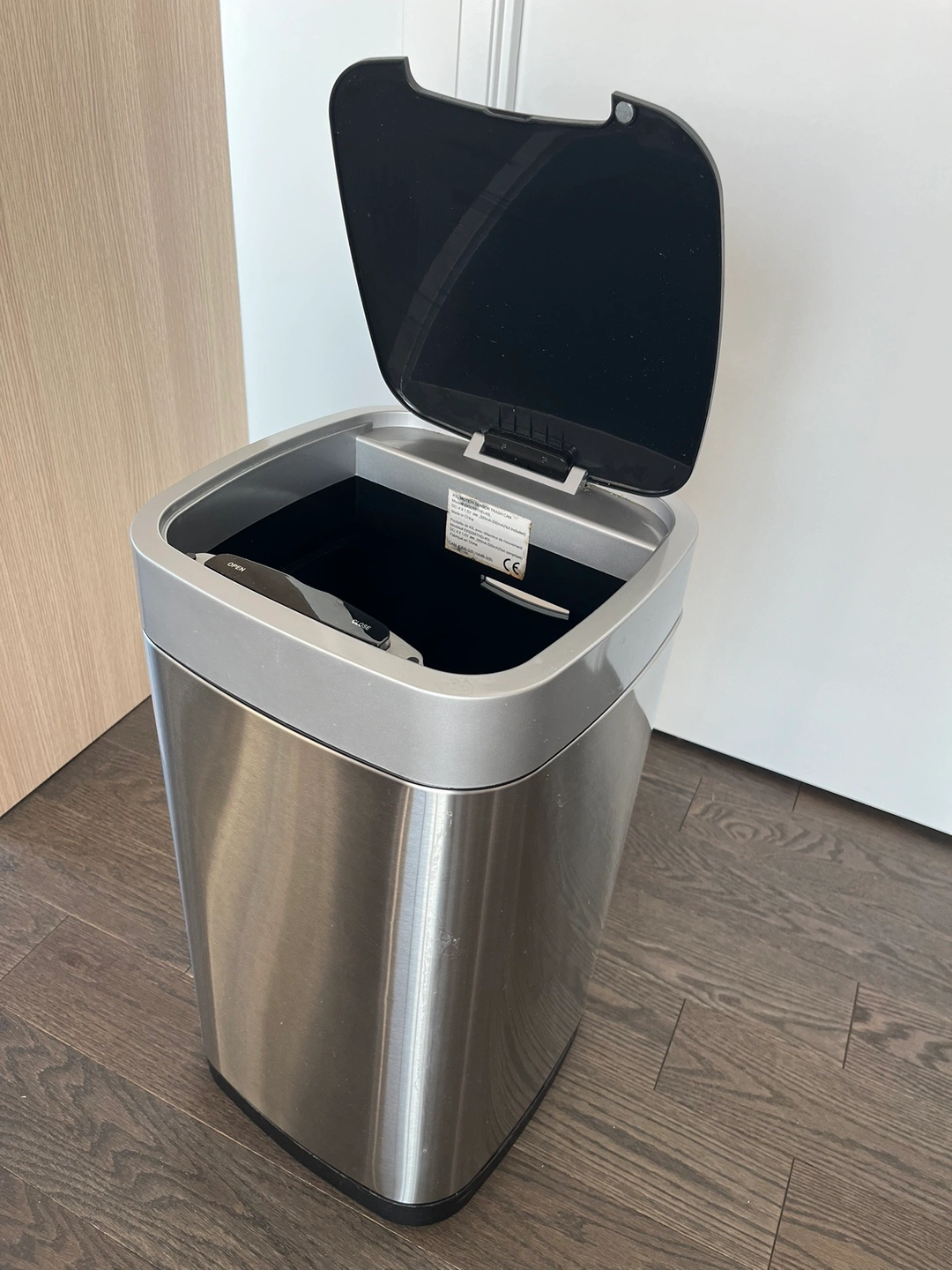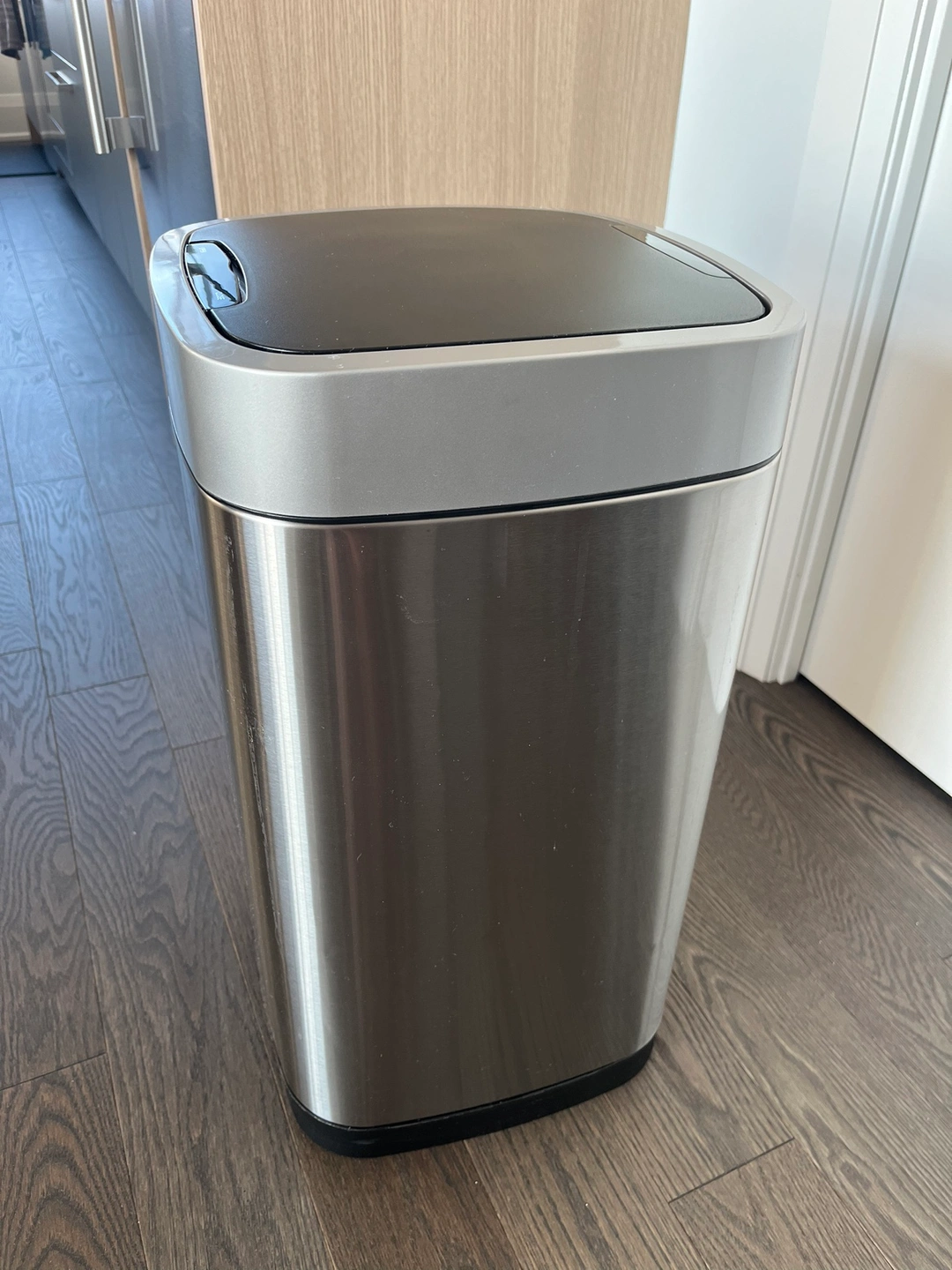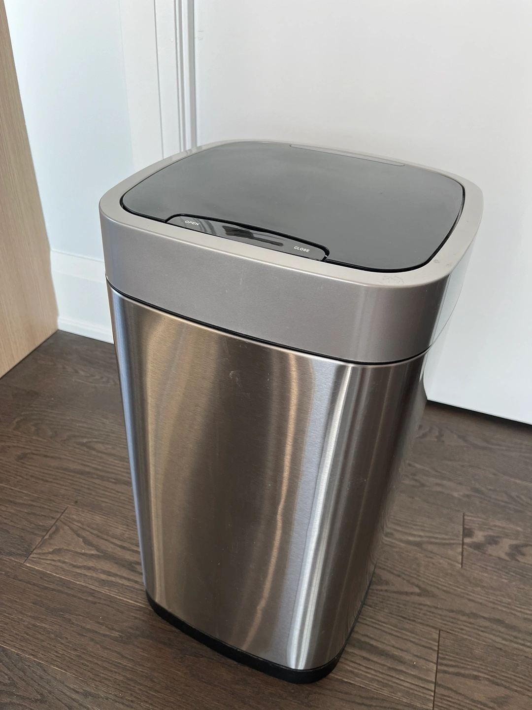The EK9288THD-40L Motion Sensor Trash Can is a 40-liter capacity trash can with several convenient features: - Infrared Sensor Mechanism: Allows for touchless operation, making it more hygienic. - Brushed Stainless Steel Finish: Fingerprint-resistant, keeping it clean and easy to maintain. - Soft-Closing Lid: Ensures a noise-free environment. - Interior Ring: Keeps the garbage bag secure inside. - Easy-Clip Design: Facilitates easy cleaning and changing of trash bags