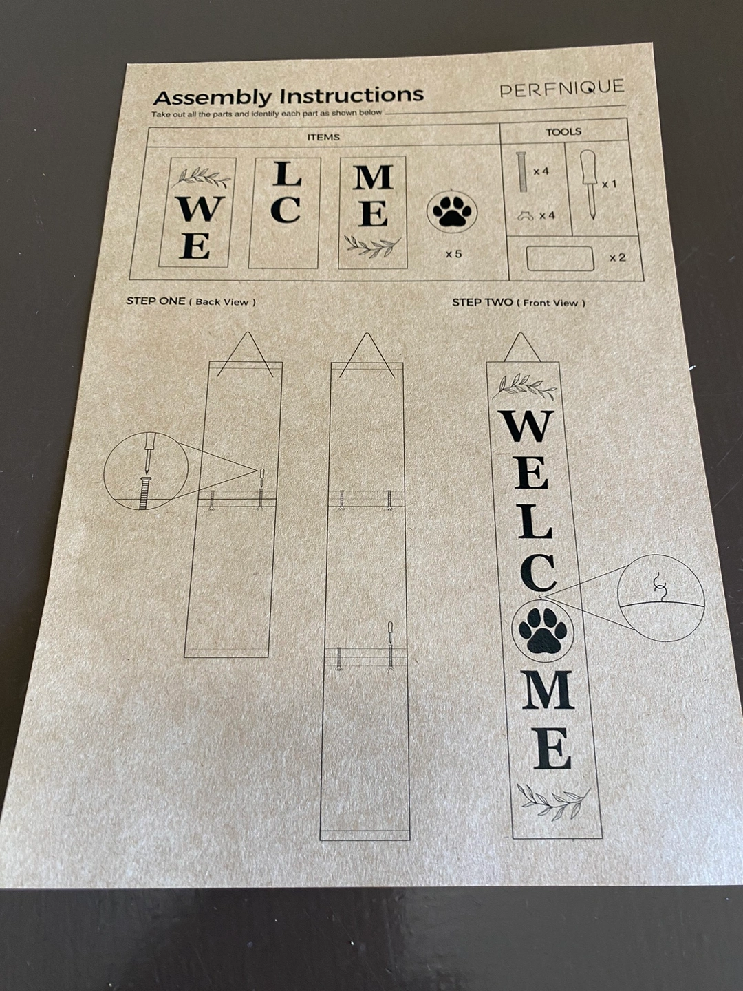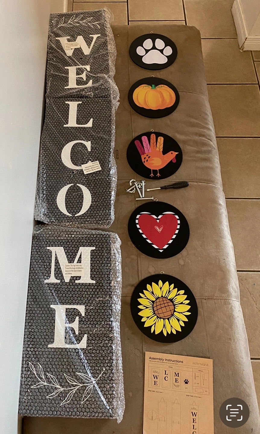 A welcome sign that includes 6 interchangeable seasonal pieces. The sign is assembled by attaching the 6 pieces to the "welcome" piece. The sign is a great way to add a touch of personality to your home.