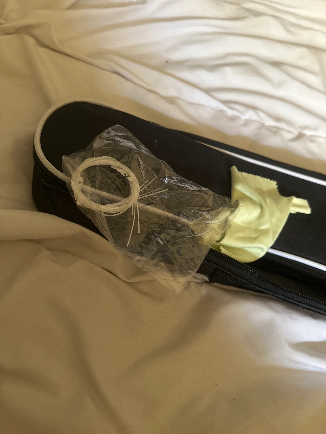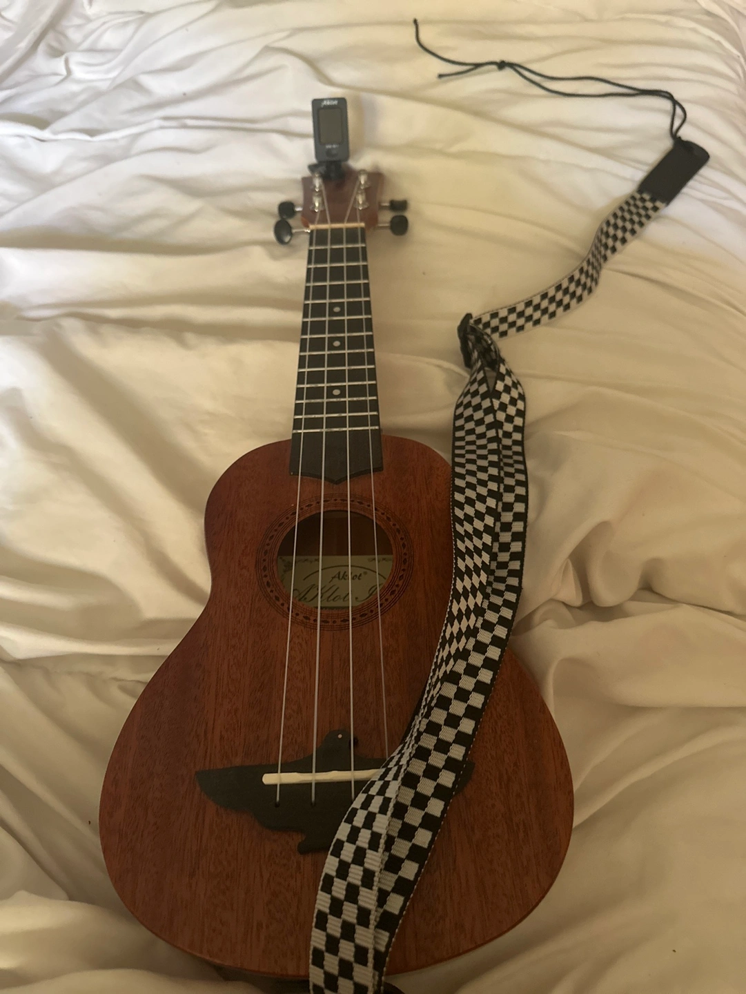 Includes a ukulele, tuner, strap, case, extra string, and cleaning cloth.