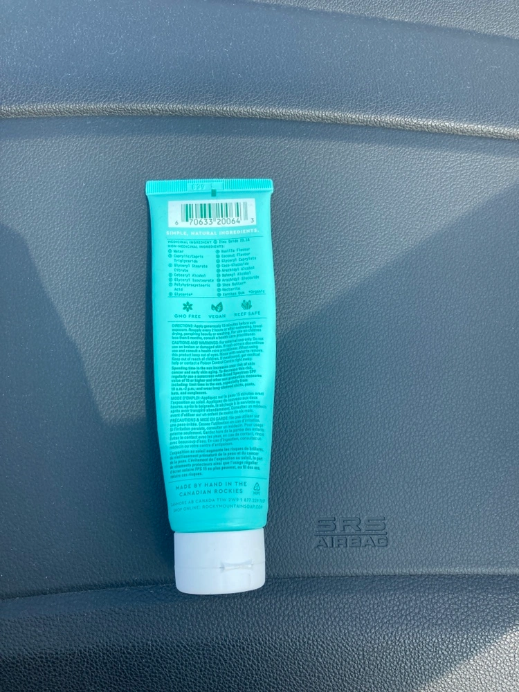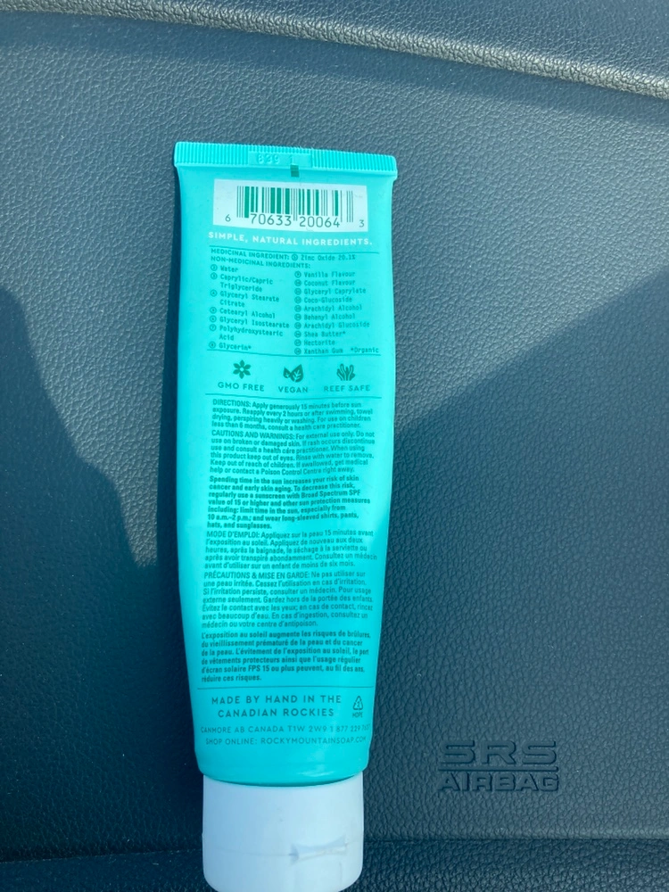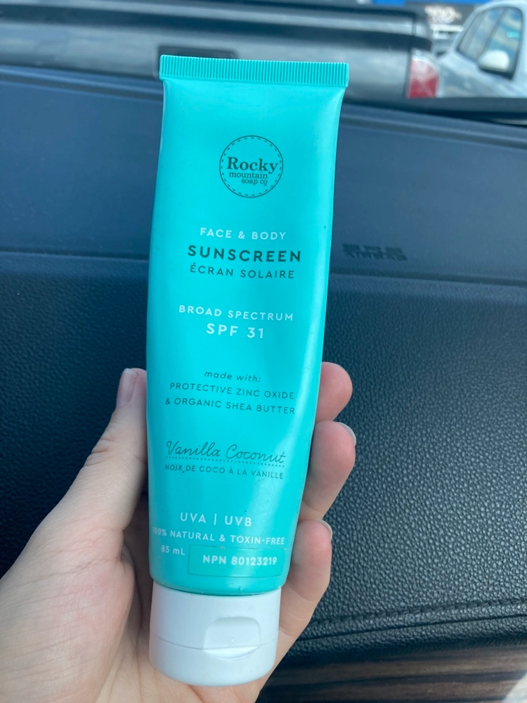 Rocky Mountain Soap Co. Sunscreen SPF 31 (85 mL) tube with vanilla coconut scent. All natural product, Canadian brand in the Rockies. Pickup Hurontario and Dundas. Cash only. Perfect if you’re going on a vacation from now until expiry February 2025. Healthier sunscreen. 2/3 of product still inside tube. Goes for 25$ + tax