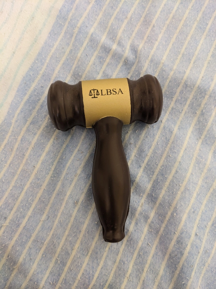 Toy in the shape of a judge's gavel. Feels like a stress ball (squishy material). Approximately 5" by 3.5". - BUY ONE $5 ITEM AND GET ANOTHER $5 ITEM FOR FREE!