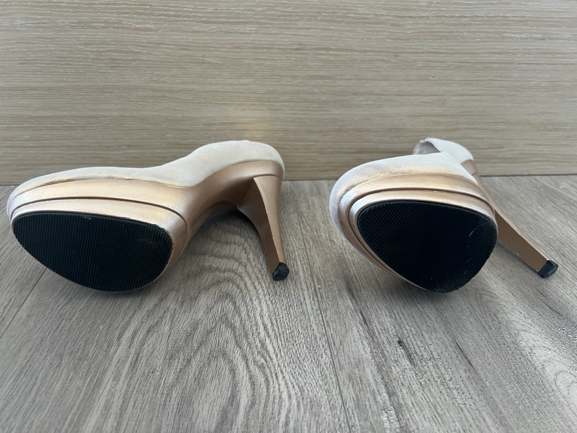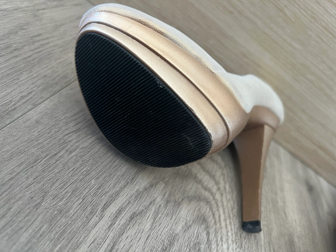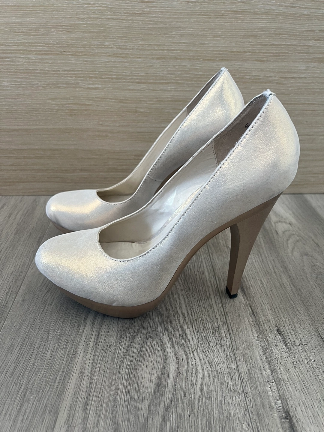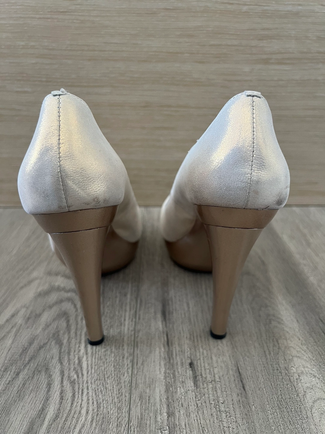 These are beautiful silver: bronze : gold shimmering heels, perfect for a night out. They feature a gold accent and are very comfortable to wear. Size 38 Too small for me.