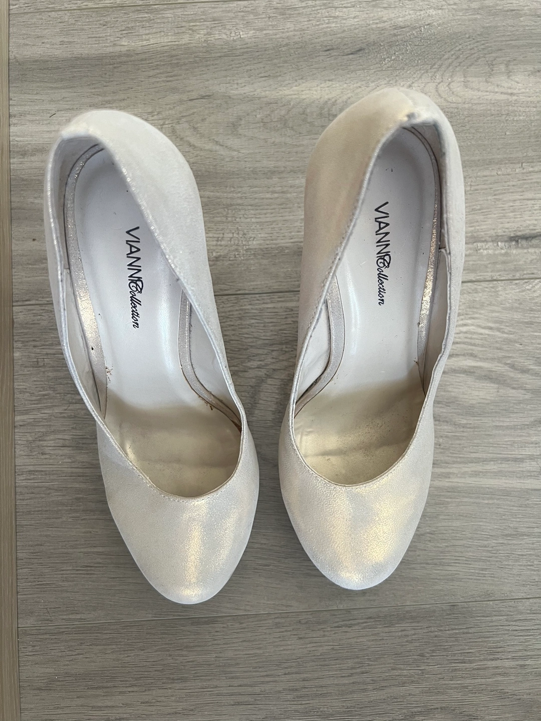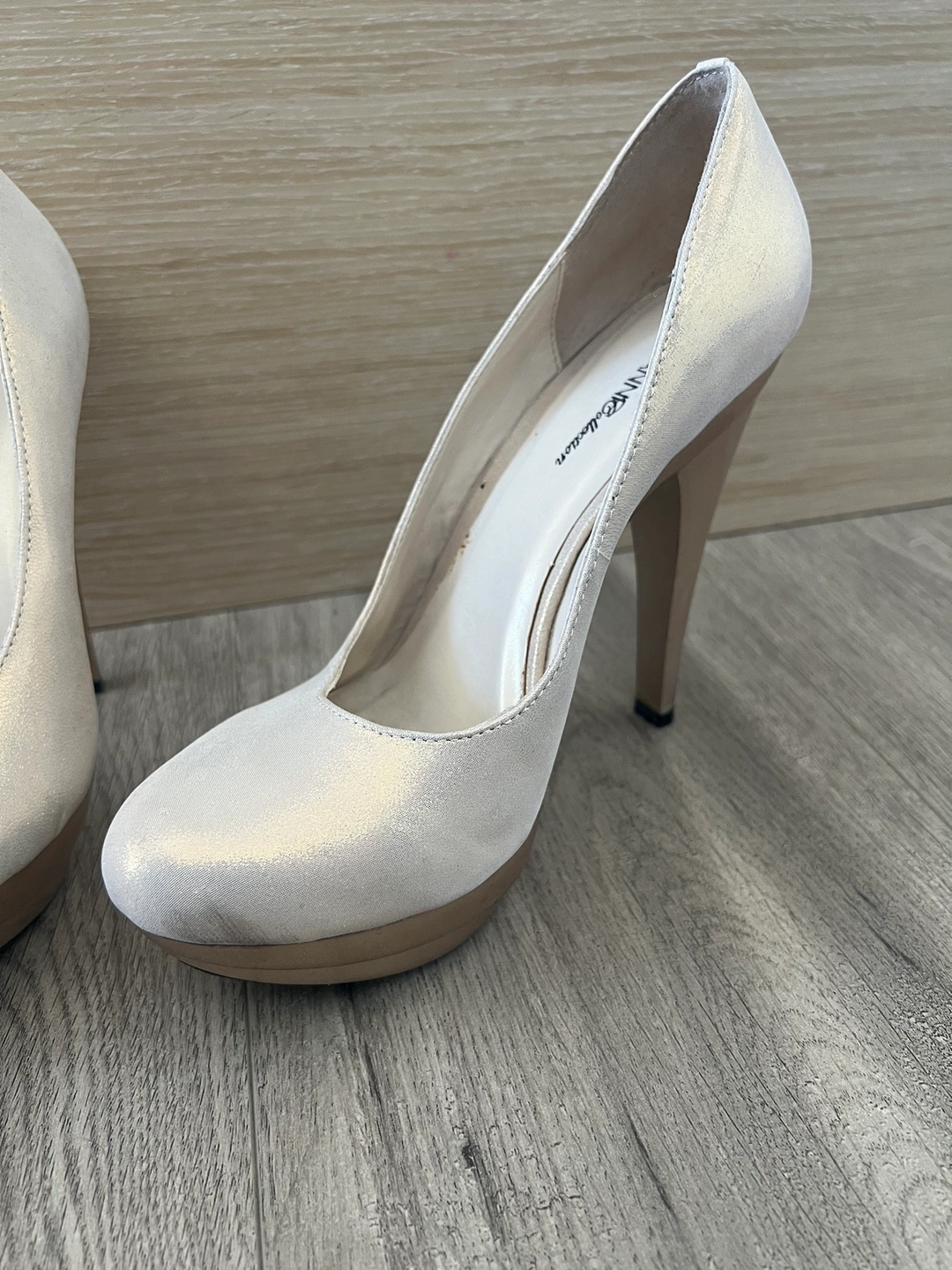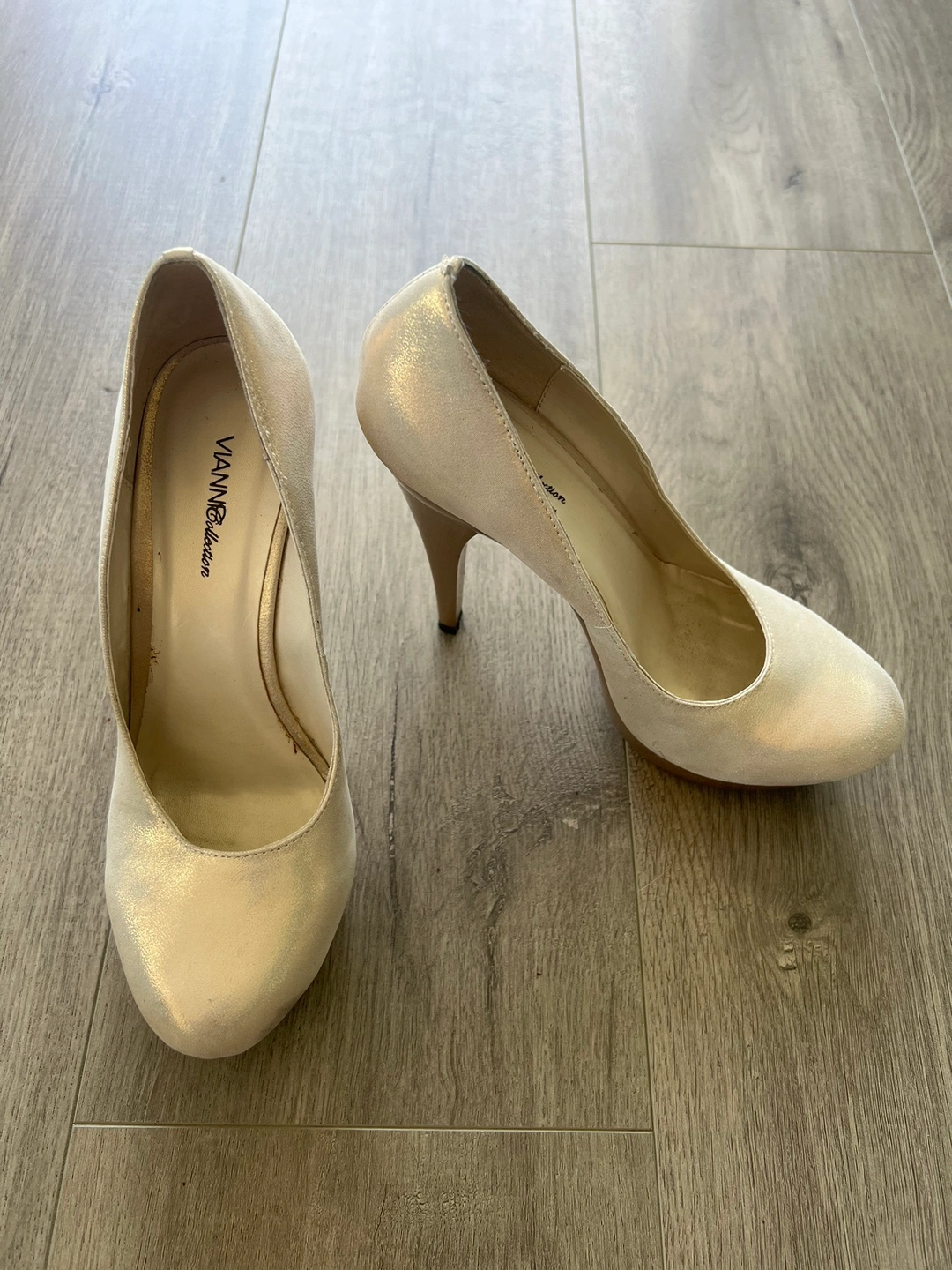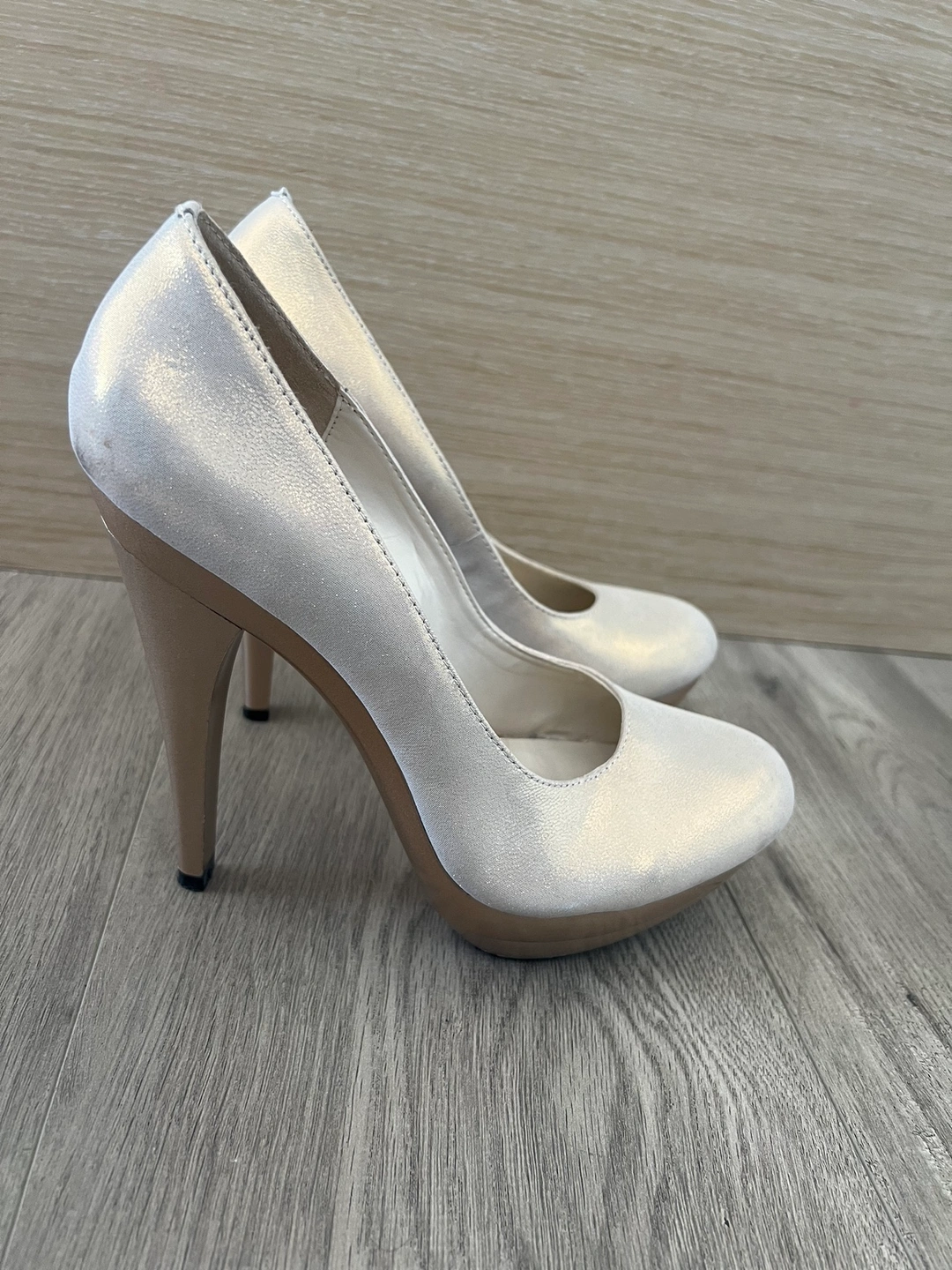 These are beautiful silver: bronze : gold shimmering heels, perfect for a night out. They feature a gold accent and are very comfortable to wear. Size 38 Too small for me.