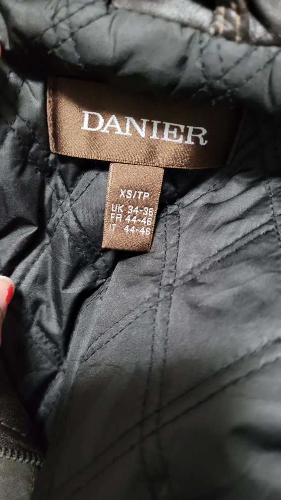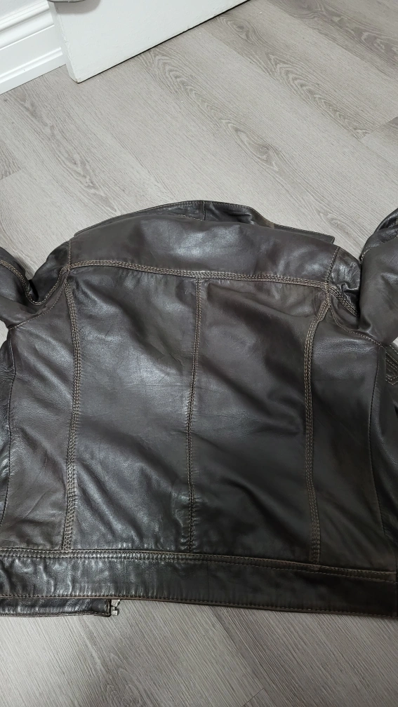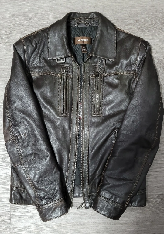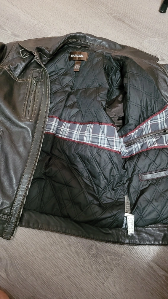 Men's Danier leather jacket with a zip up front and multiple pockets. The jacket has a quilted lining.