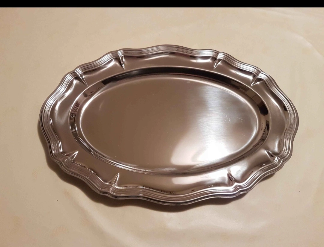 New, never used, excellent quality that comes from an SF/PF home Serving tray made of stainless steel. It has a slightly raised rim with a decorative edge. $60 each or both for $100
