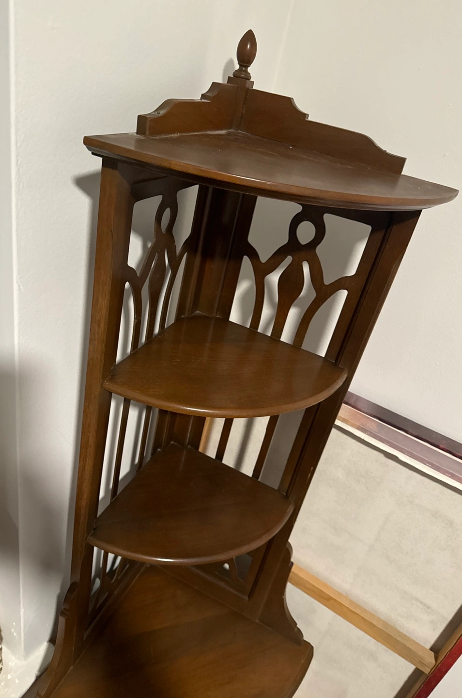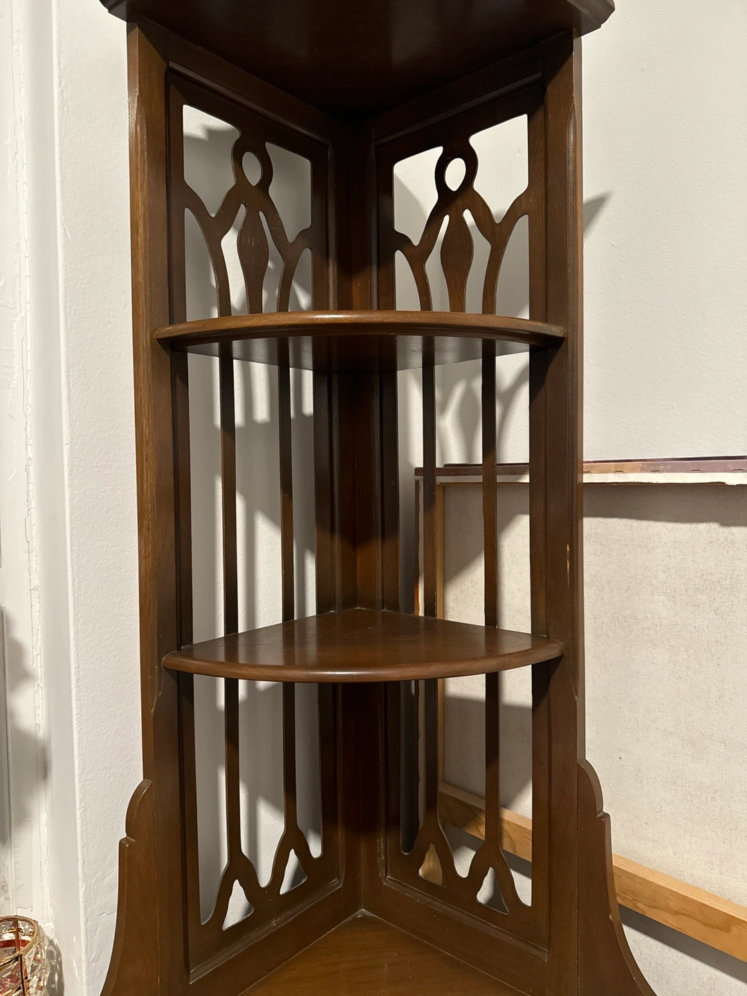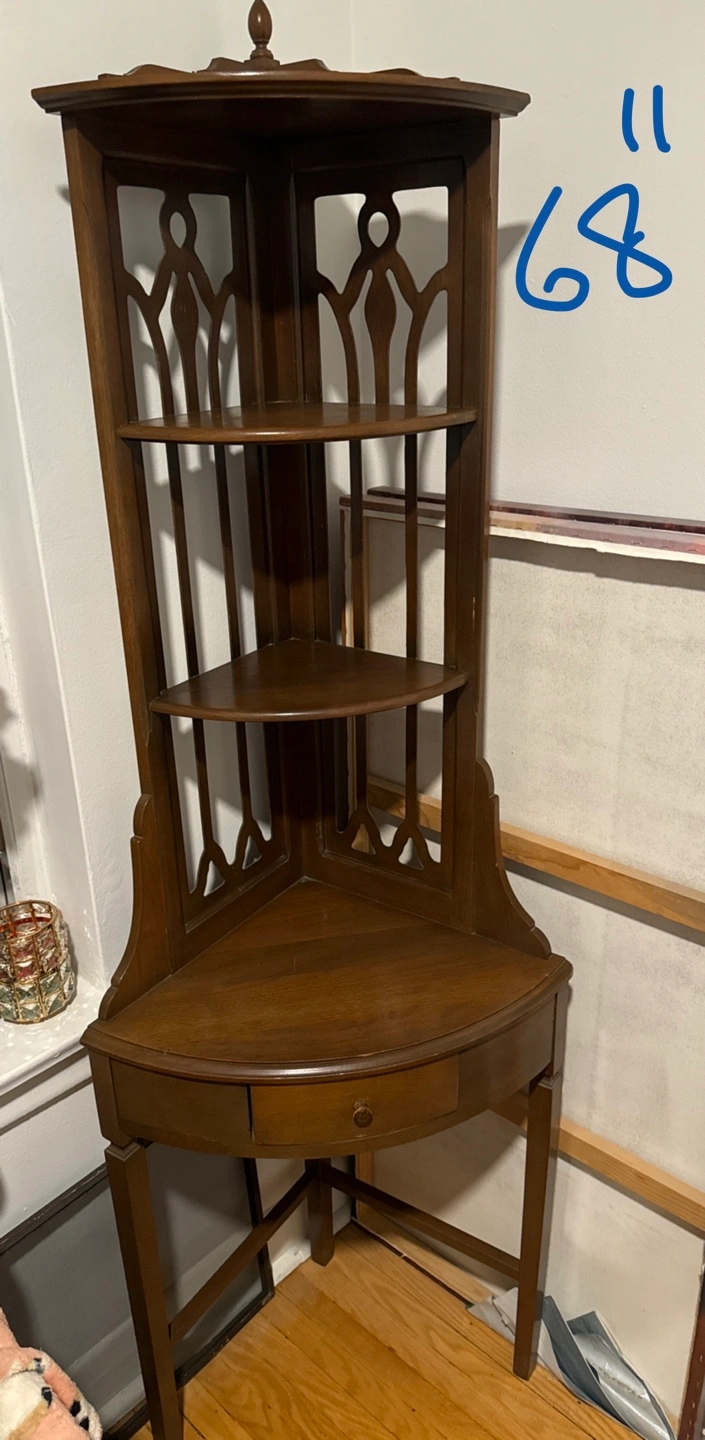 Corner shelf with a single drawer and three shelves. Made of dark wood. In great shape. Beautiful & sturdy antique corner that adds a vintage touch to any room and with plenty of room so you can showcase your collection. Pickup only Cash / etransfer