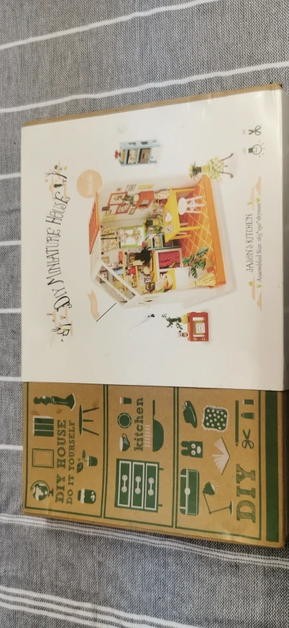 This is a wooden miniature house kit to build. It comes in a box with instructions and materials. The finished house looks like a kitchen.