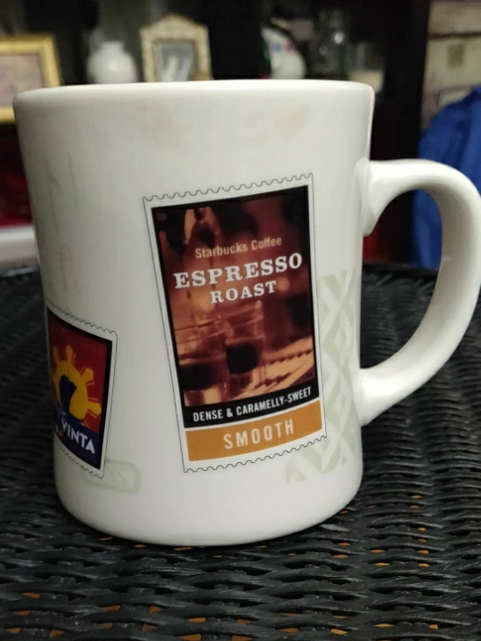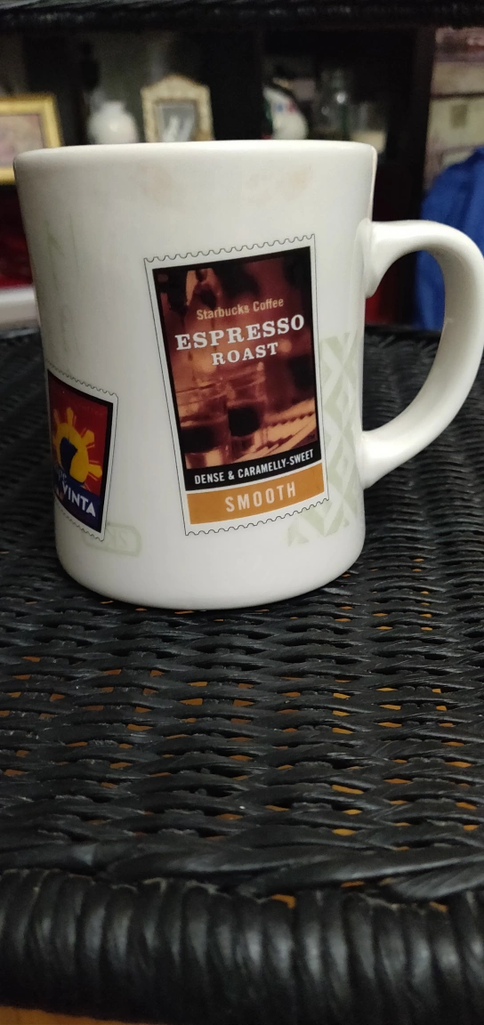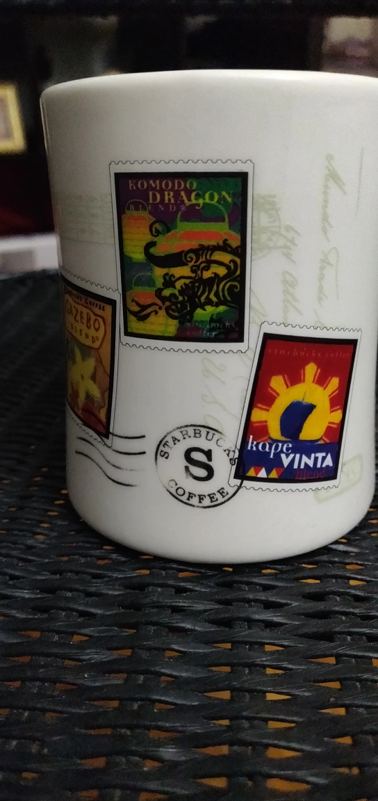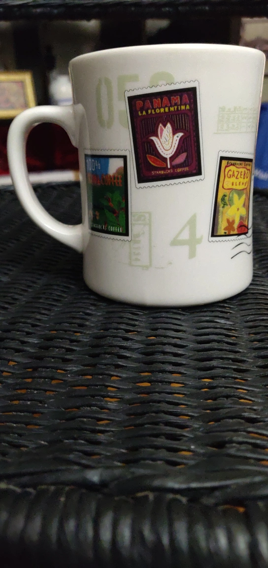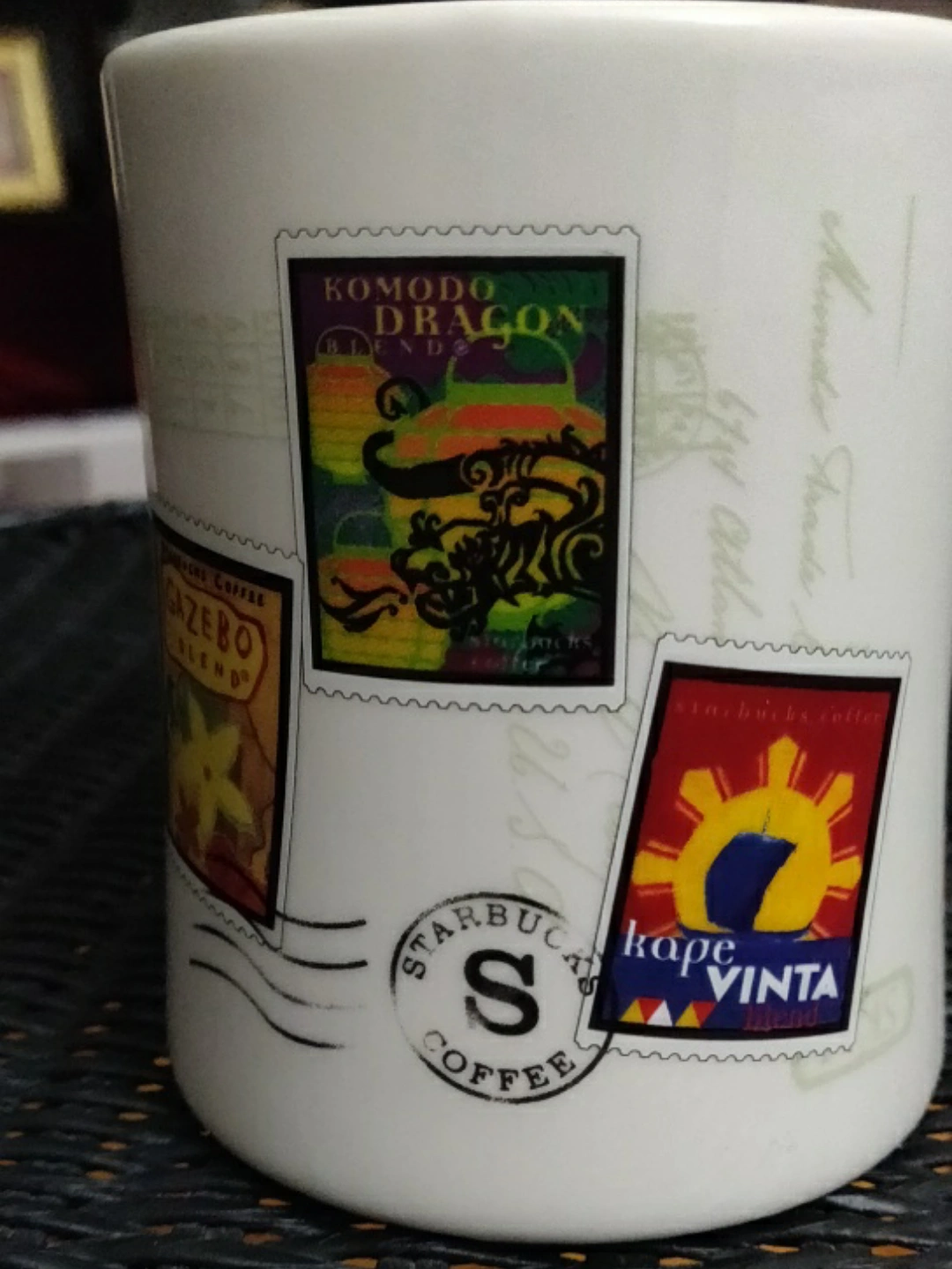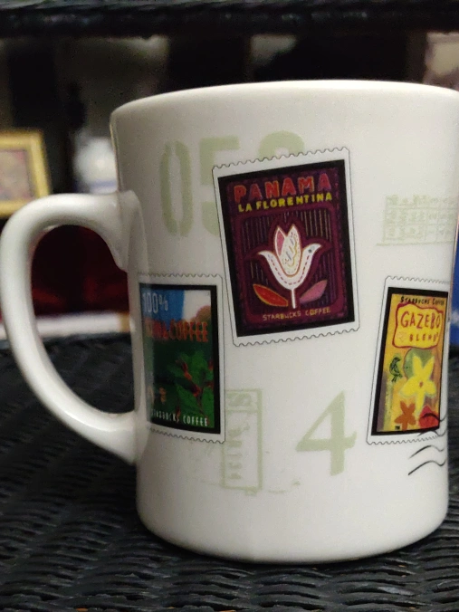 This mug is decorated with a stamp theme. It is a white mug with a large handle. There are a variety of Starbucks blends represented on the mug. It features a green, orange, and purple colour scheme with a stamp design.