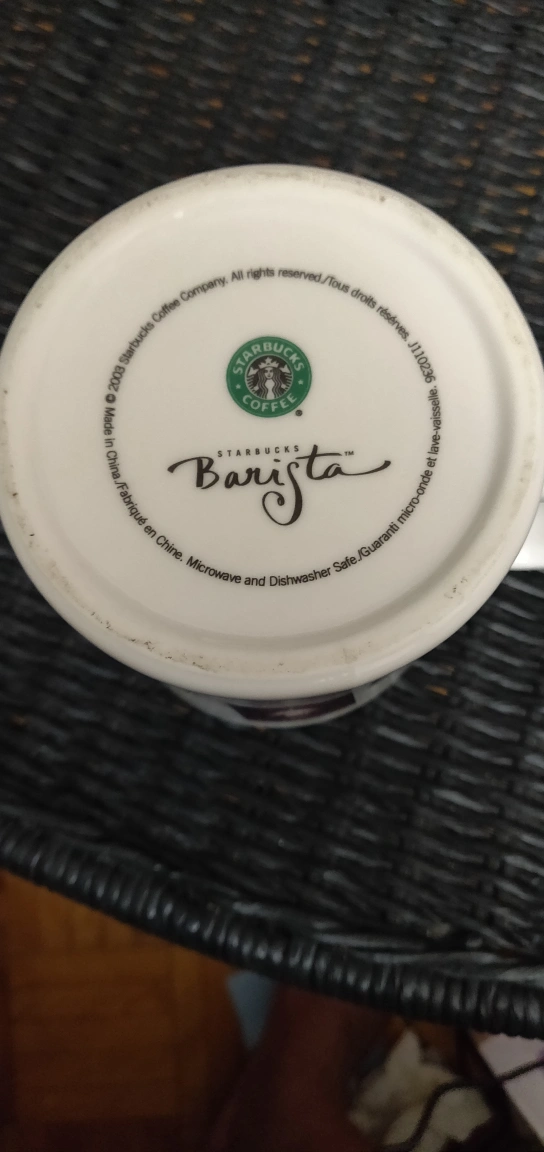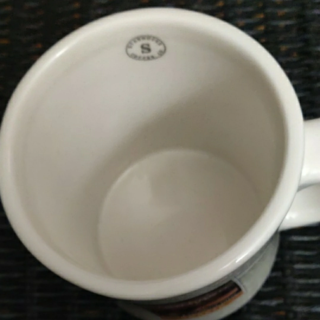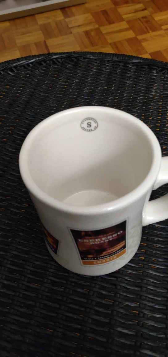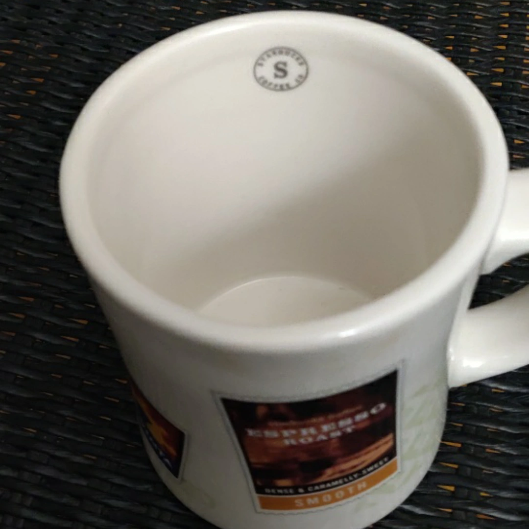 This mug is decorated with a stamp theme. It is a white mug with a large handle. There are a variety of Starbucks blends represented on the mug. It features a green, orange, and purple colour scheme with a stamp design.