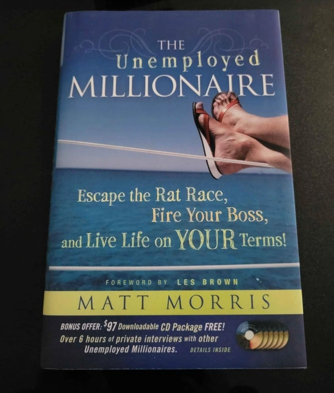 This is a hardcover book by Matt Morris called "The Unemployed Millionaire". The cover features a photo of a person with their feet propped up. The book also has a foreword by Les Brown and includes a bonus CD package with over 6 hours of private interviews with other Unemployed Millionaires.