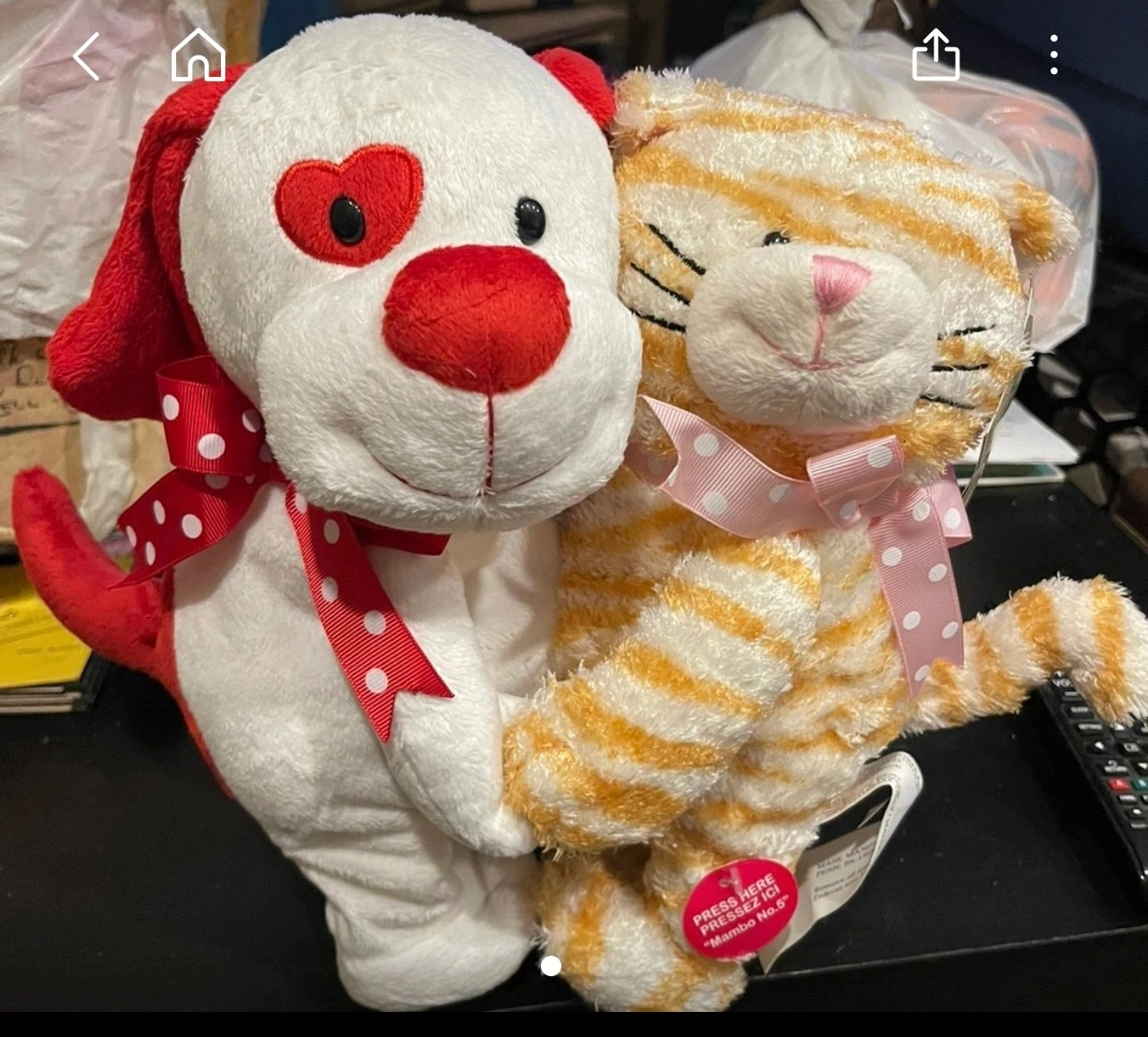 This is a plush toy of a dog and cat that sing a song together. The dog is red and white and has polka dots on its collar. The cat is white and yellow with stripes. Both have a pink bow on their neck. It doesn’t play the song anymore. From Carlton Cards. Hoping some young child will like this & put a smile to their face. Pick Up In Lobby •