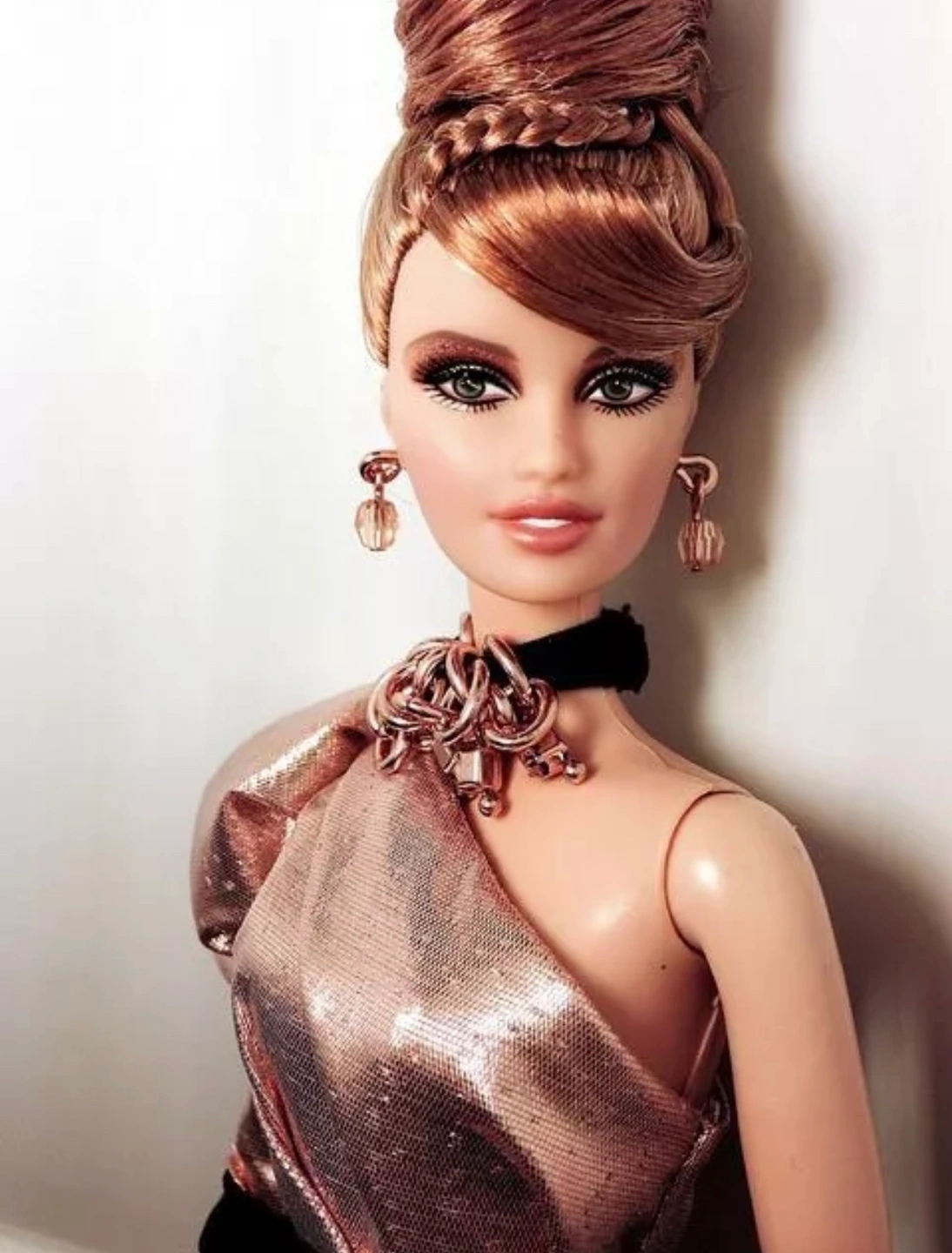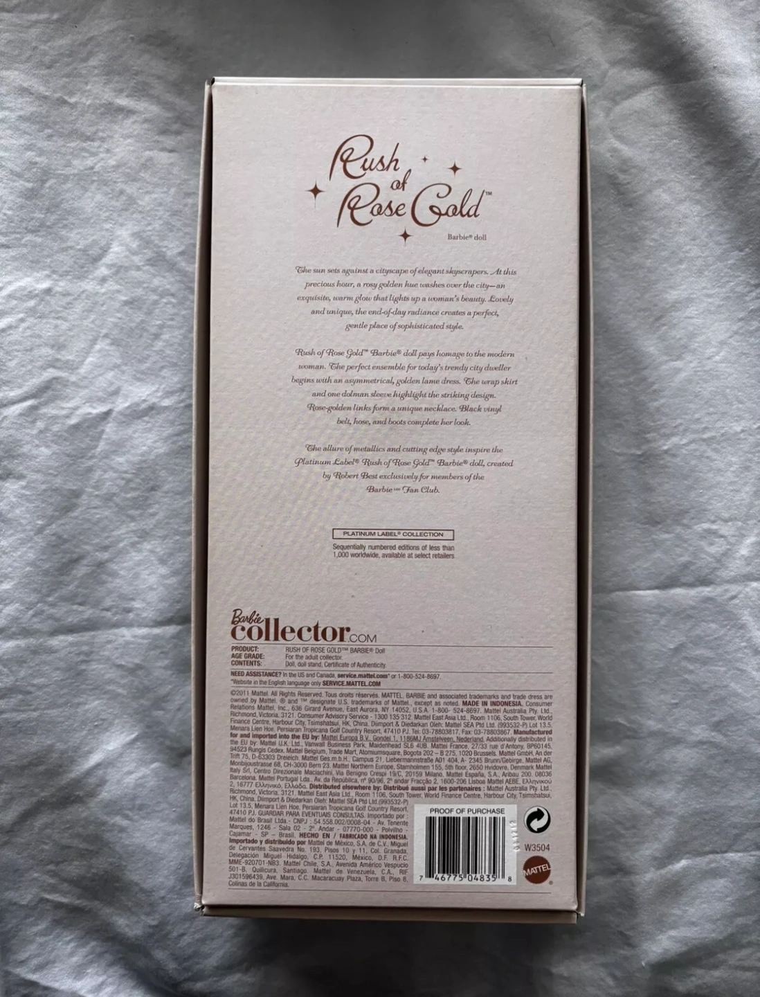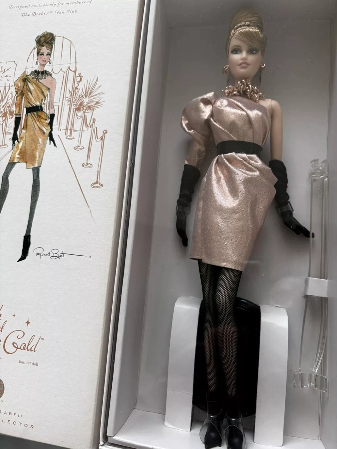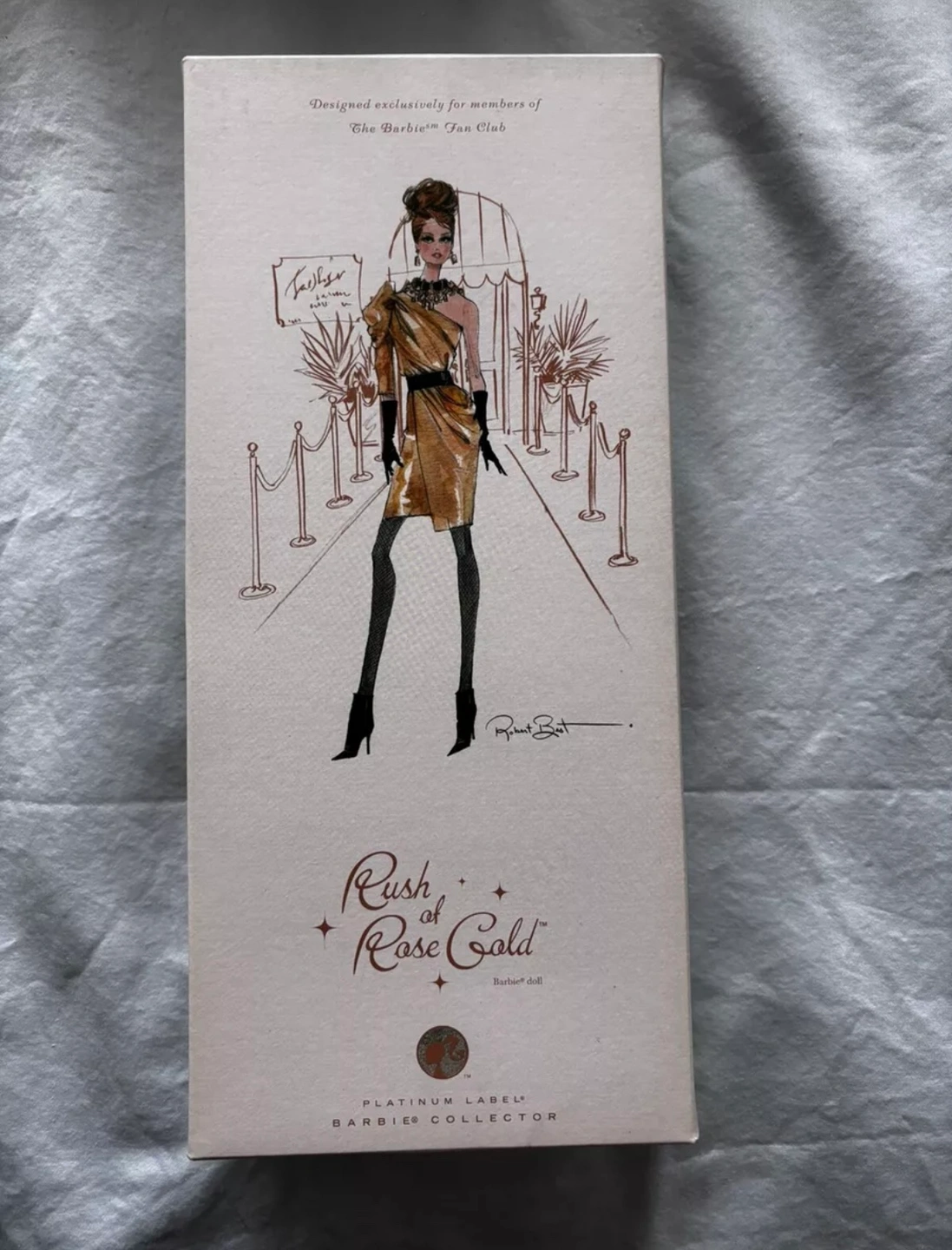 Striking and sophisticated, Rush of Rose Gold Barbie doll is stunning in an asymmetrical dress of glamorous golden lamé. A single dolman sleeve makes a bold statement, while the wrap skirt falls just above her knees, adding to the modern silhouette. The black vinyl belt, hose and boots offer elegant contrast, while rose-golden accessories add the final stylish touch. Created by Robert Best exclusively for members of the 2012 Barbie℠ Fan Club. New in the box, was never removed from it. For more information please view the photos. Comes from a clean, non smoking home. Platinum label, very rare collectible. Less than 1000 were produced worldwide. For adult collectors. Selling this item on multiple platforms. This is the lowest price for it.