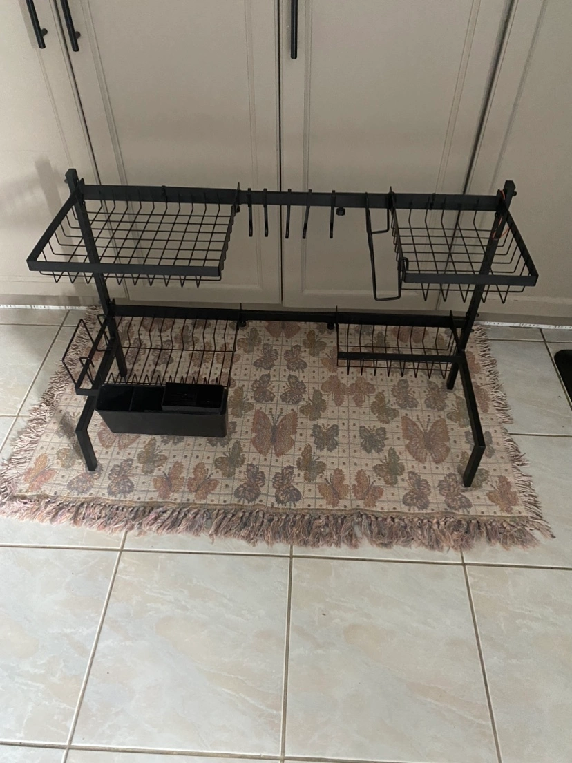 A two-tiered dish drying rack with a cutlery holder and a utensil holder. The rack has multiple shelves and a lower rack for storing dishes.