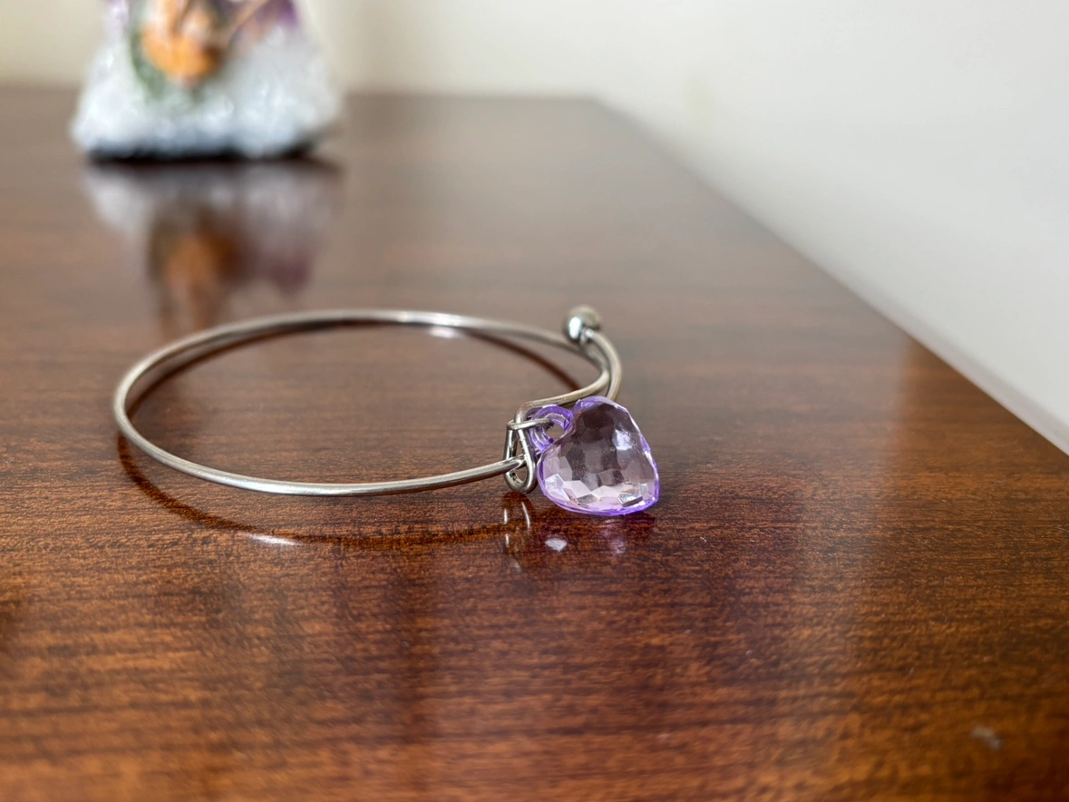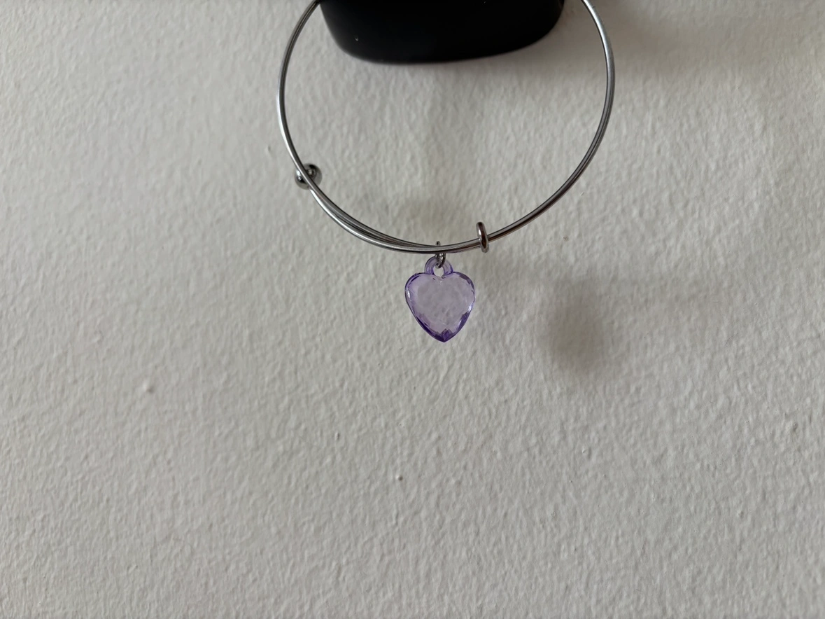 Silver adjustable bracelet with a purple plastic heart charm. Can be inspected during pickup. Please see my bio for payment and pickup details!