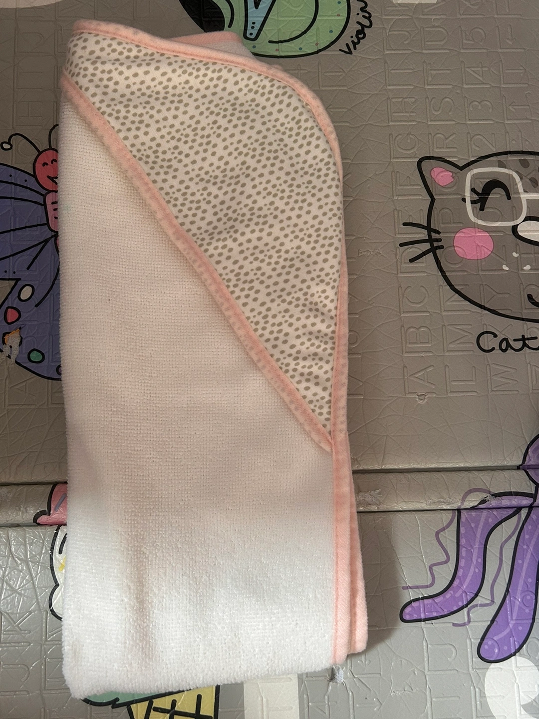 White hooded towel with pink trim and grey polka dots on the hood.