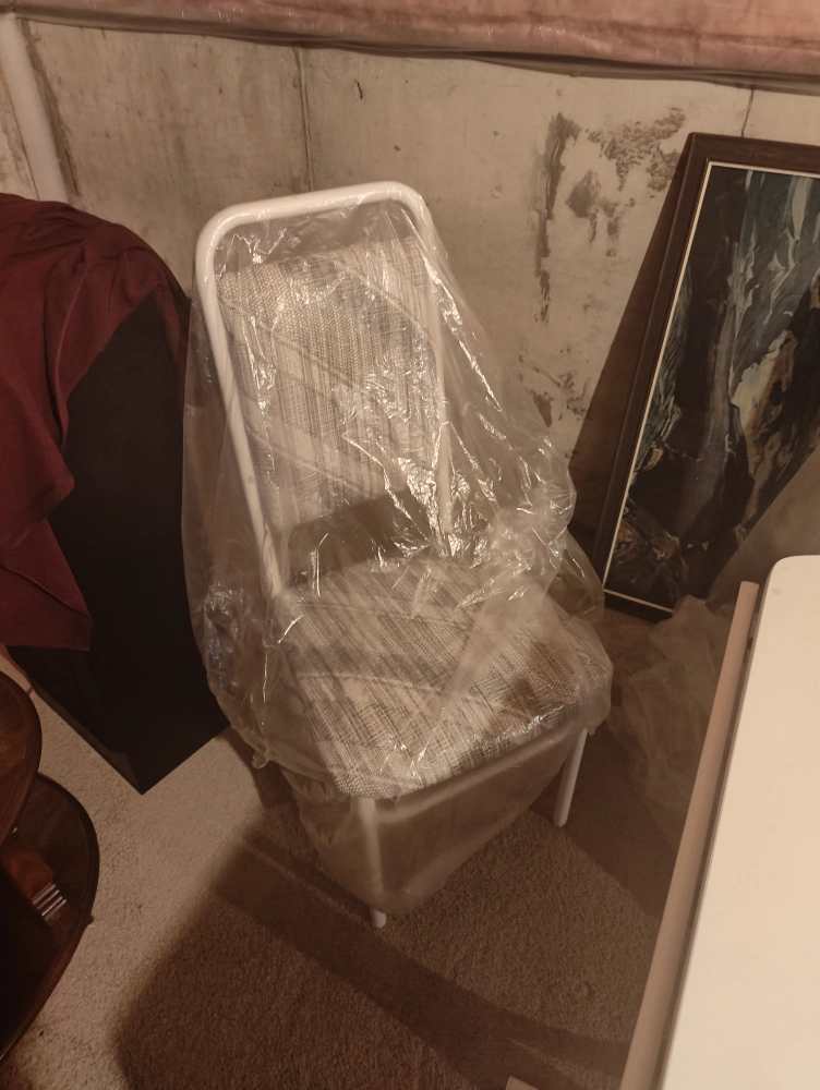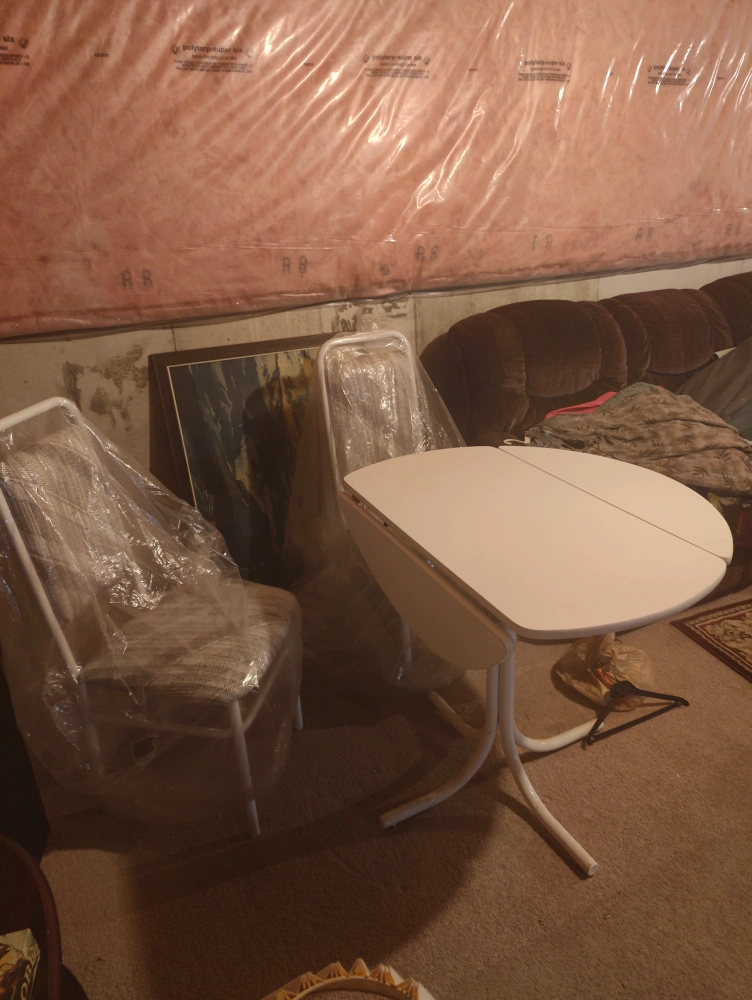 White folding table and two chairs with white metal frames and fabric seats. The table folds in half to make it easier to store. Was never used, my grandmother bought it then she moved in with us. 36" round x leaf 9" tall 30"