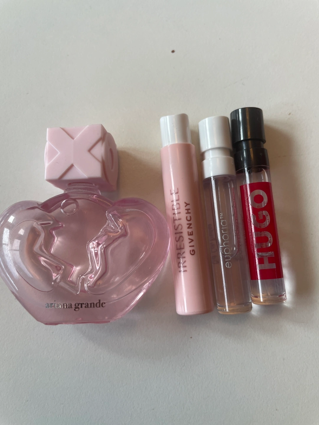 A set including Ariana Grande perfume and samples of Givenchy Irresistible, Calvin Klein Euphoria and Hugo Boss perfume.