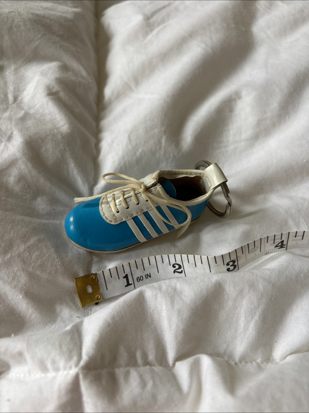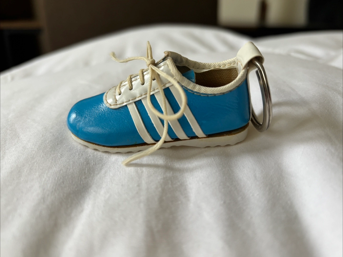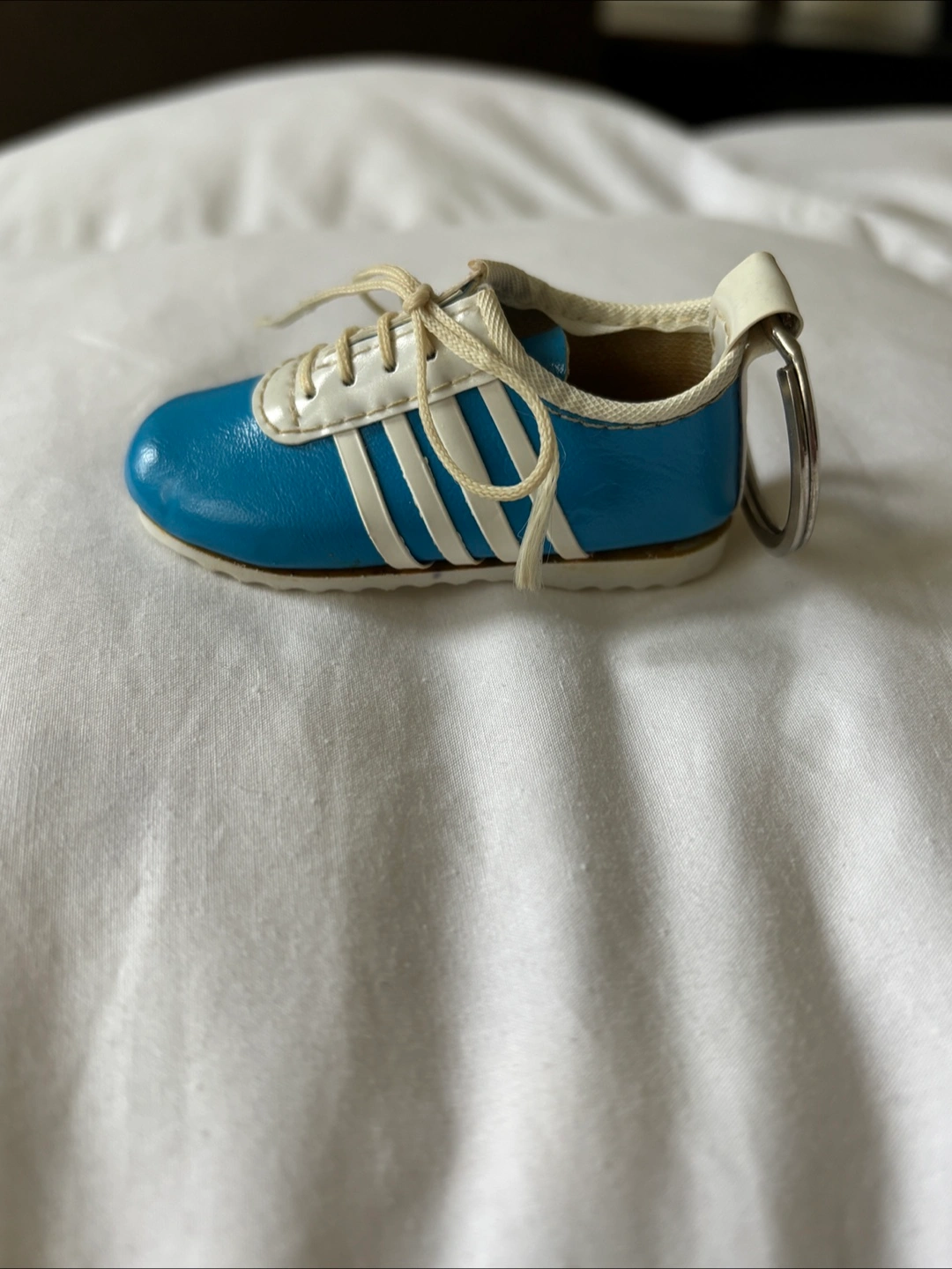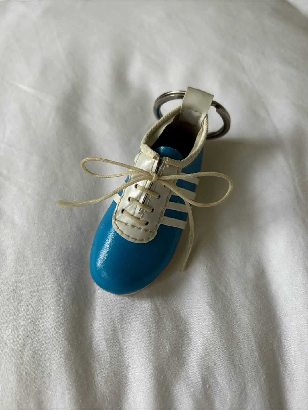 Vintage 80’s light blue shoe keychain with 4 white stripes on the side. Made in Taiwan. About 3 inches in length. Has what looks to be a cork “insole”. Slight fraying of the strings but otherwise in very good condition. Cash only. Pick up at RBC Bathurst and Sheppard or see my bio for other location options! I’m available to answer any questions :) #keychain #vintage