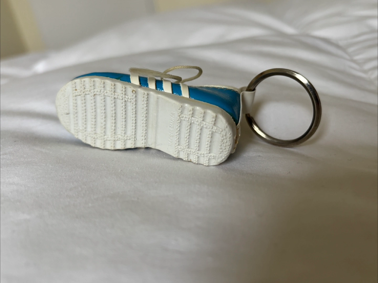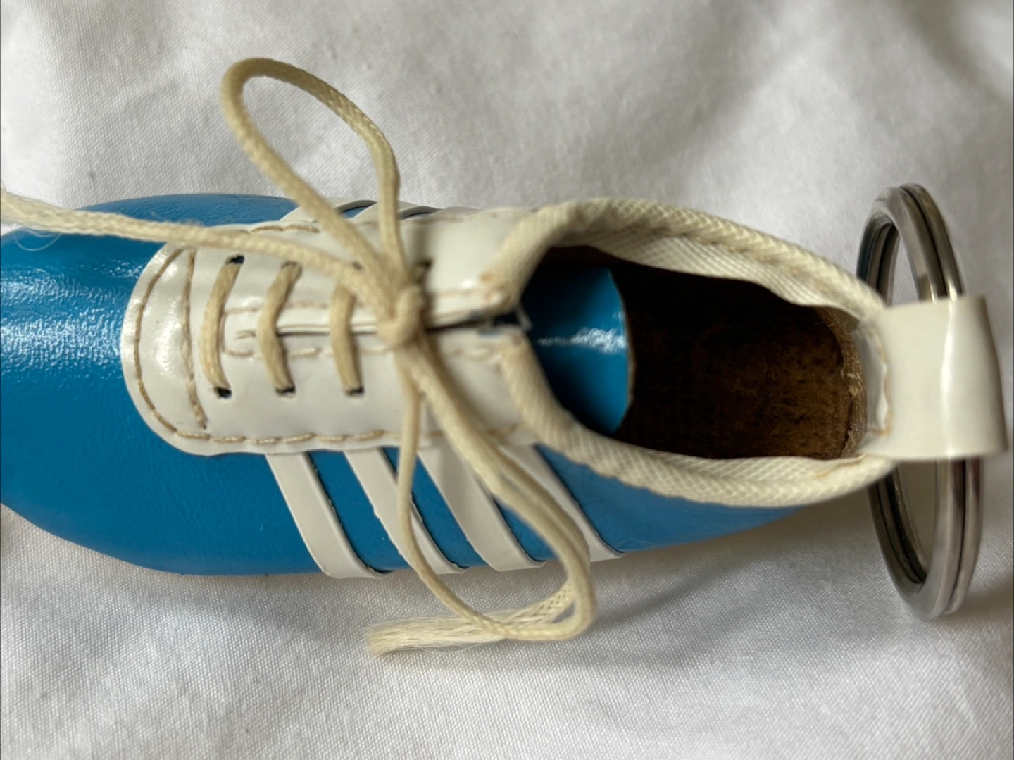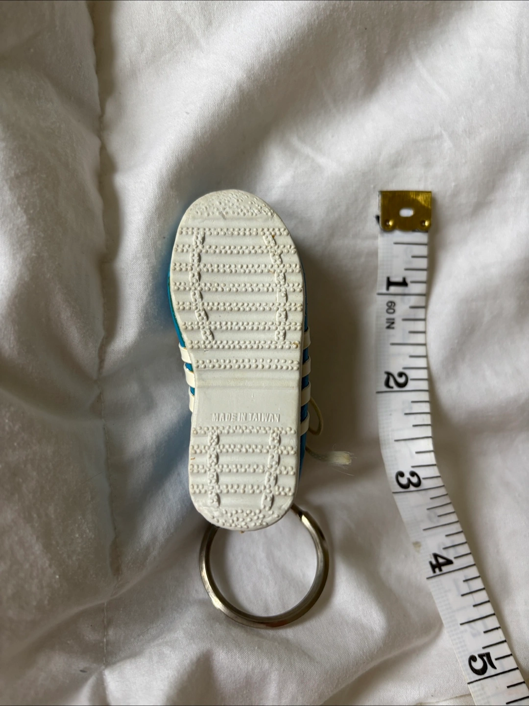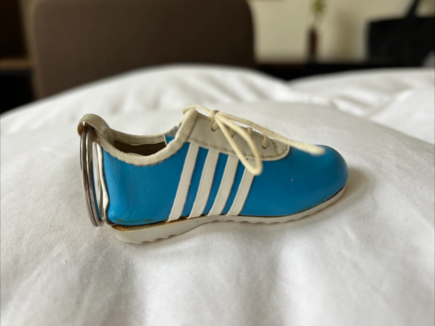 Vintage 80’s light blue shoe keychain with 4 white stripes on the side. Made in Taiwan. About 3 inches in length. Has what looks to be a cork “insole”. Slight fraying of the strings but otherwise in very good condition. Cash only. Pick up at RBC Bathurst and Sheppard or see my bio for other location options! I’m available to answer any questions :) #keychain #vintage