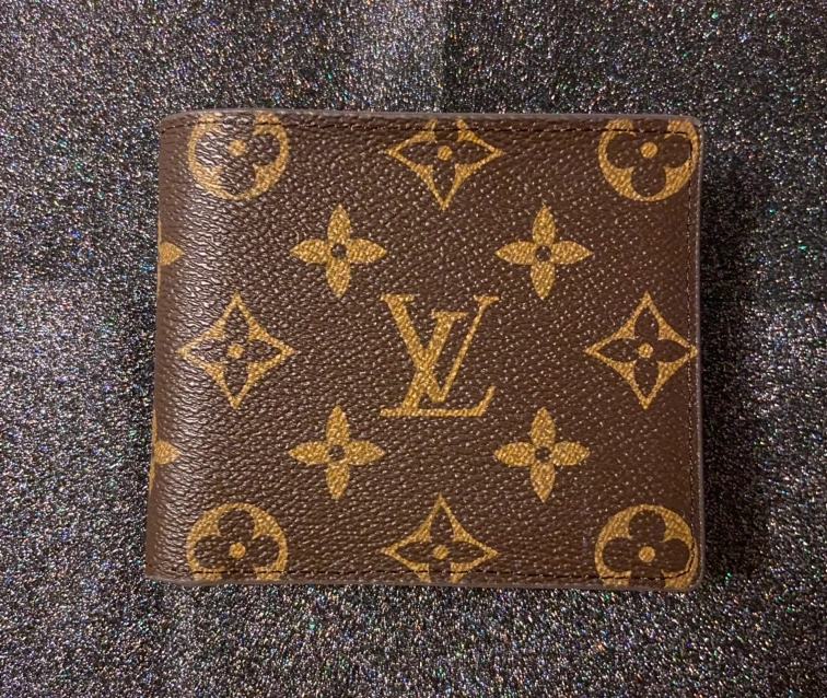 This is a men's wallet made by Louis Vuitton. It has a brown and gold colour scheme with a classic monogram print. The wallet has multiple card slots, a billfold, and a small pocket for coins. Authentic. Wallet is brand new but box is a little worn from storage.