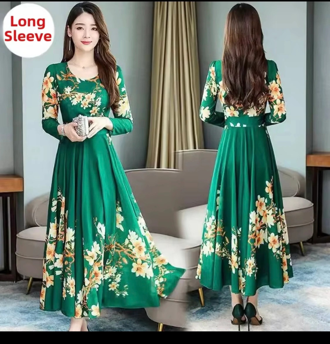 A beautiful green dress with a floral print. It has a round neckline and long sleeves. The dress is flowy and flattering.