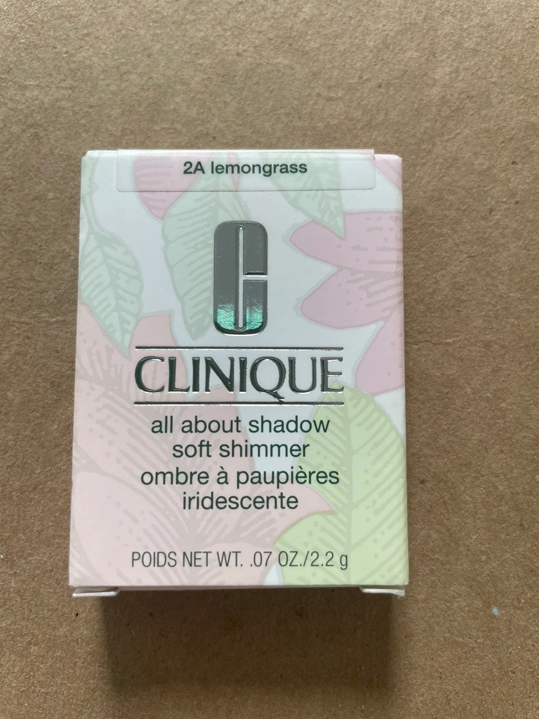 This is a Clinique All About Shadow Soft Shimmer Eyeshadow in the shade 2A Lemongrass. It comes in a small compact with a mirror and applicator.