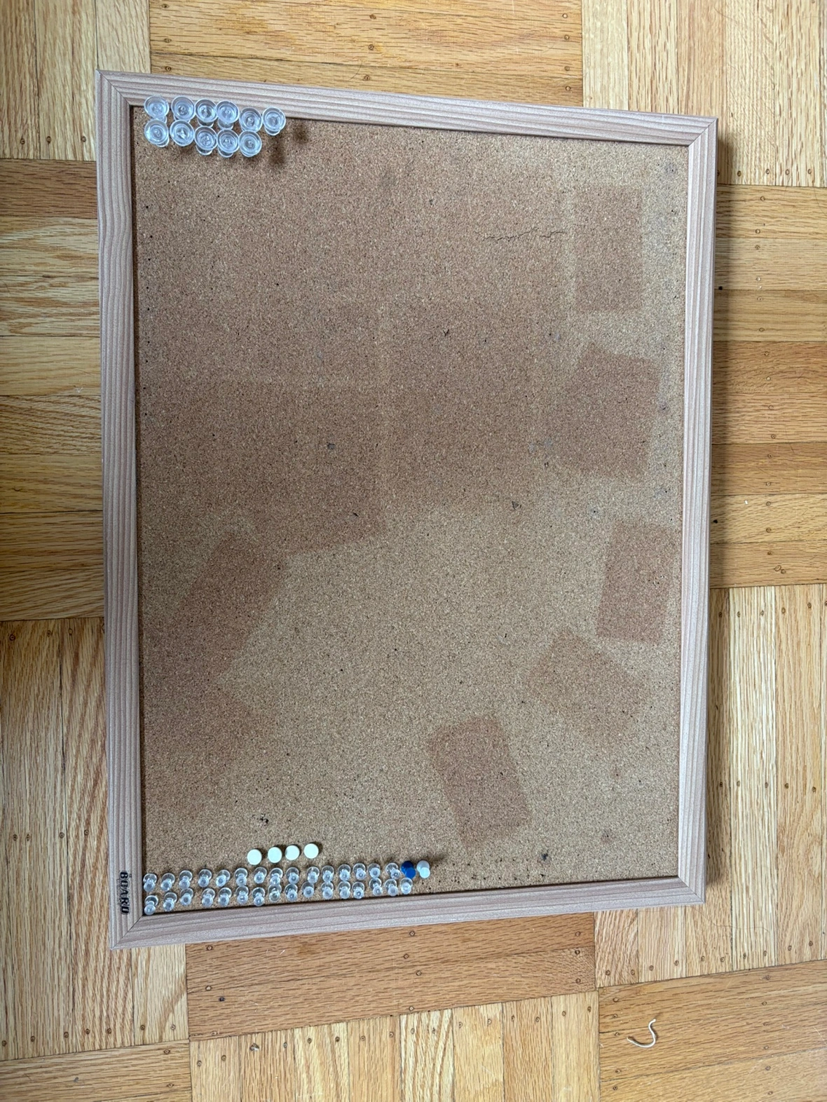 A corkboard with a wood frame. It comes with a lot of pushpins. Pick up at 1120 Barclay. Today please ☺️