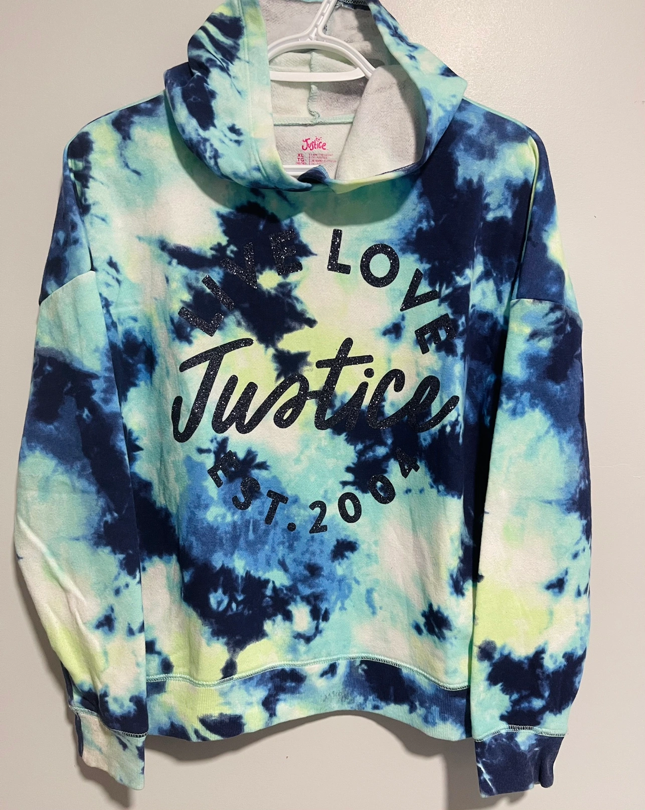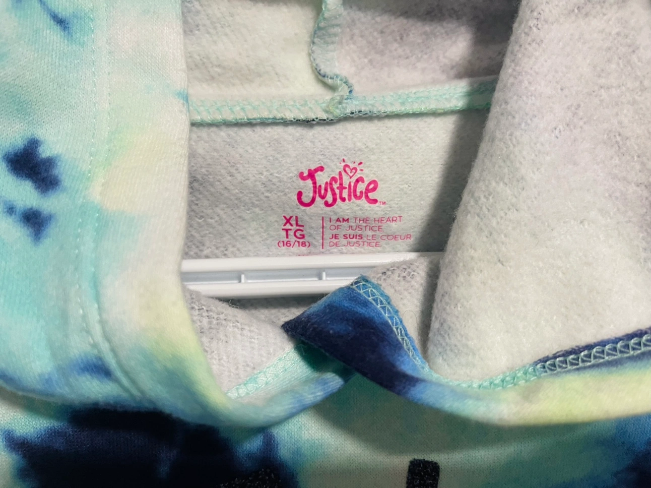 Justice Tie Dye Hoodie perfect for Fall. Size XL (16-18) blue, green and white tie dye hoodie with Justice logo on front. Like very new.