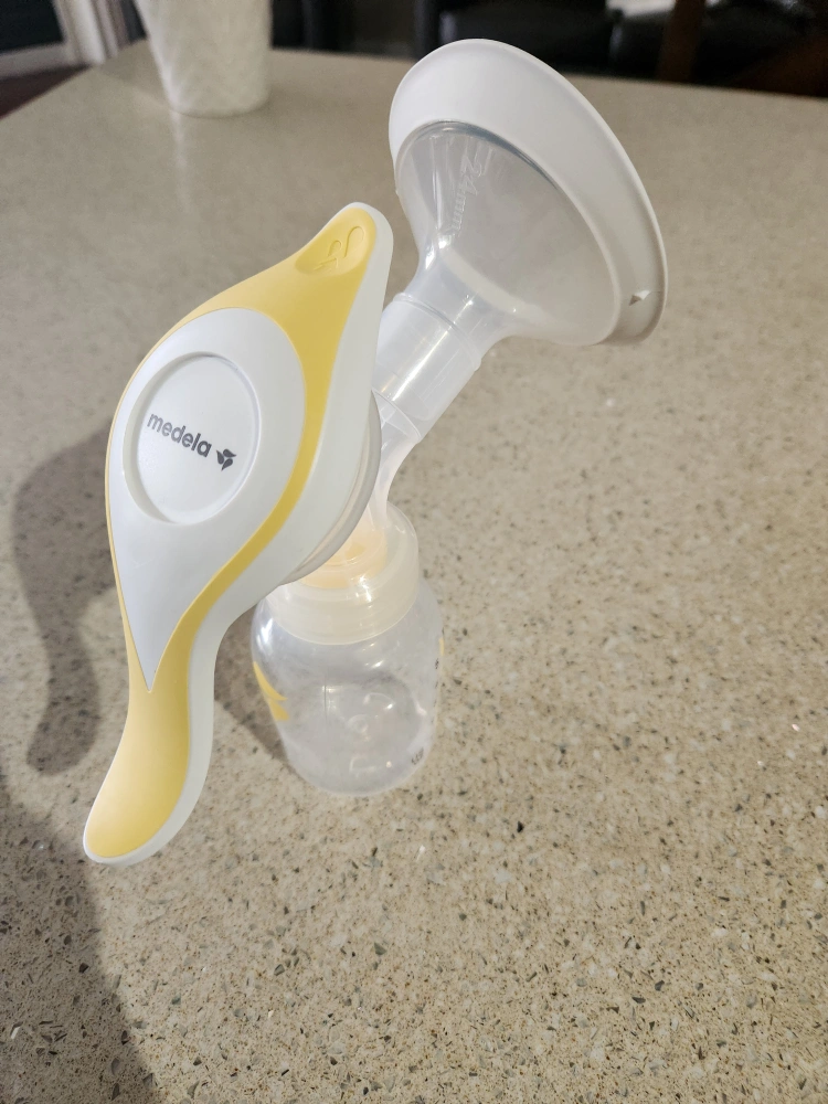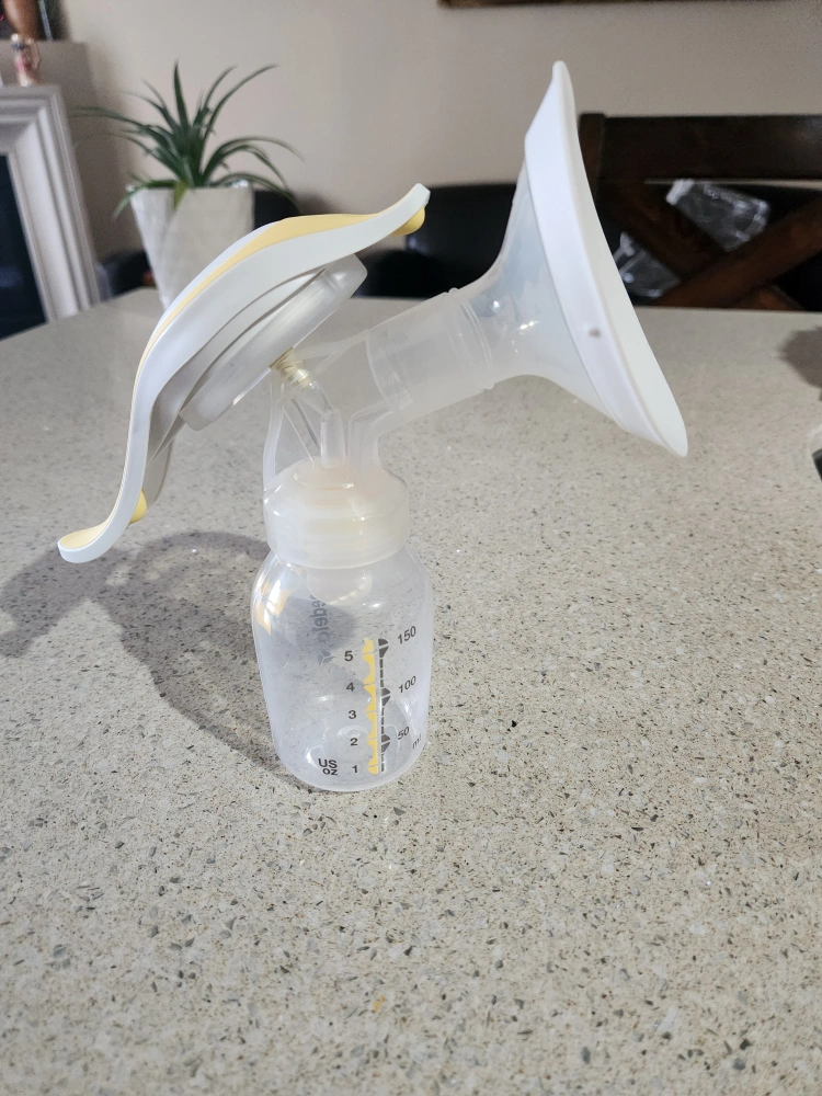 A manual breast pump, includes a bottle with a lid, a funnel, and a handle.