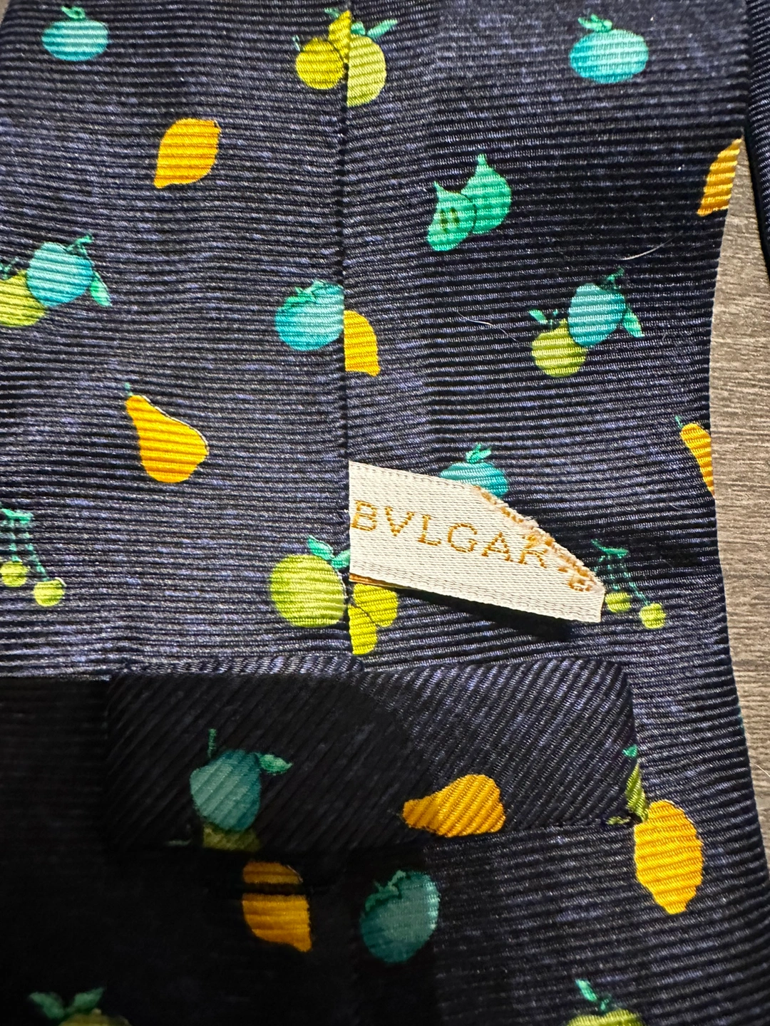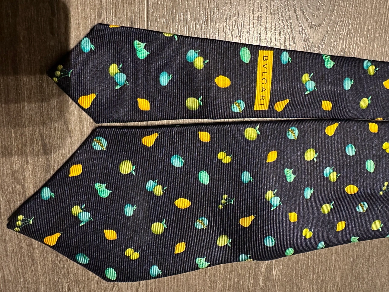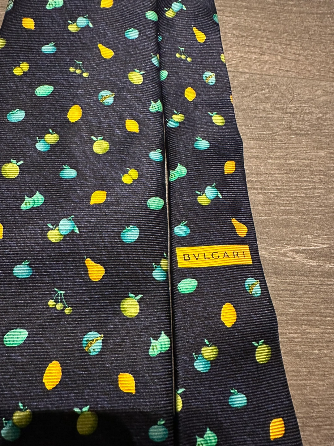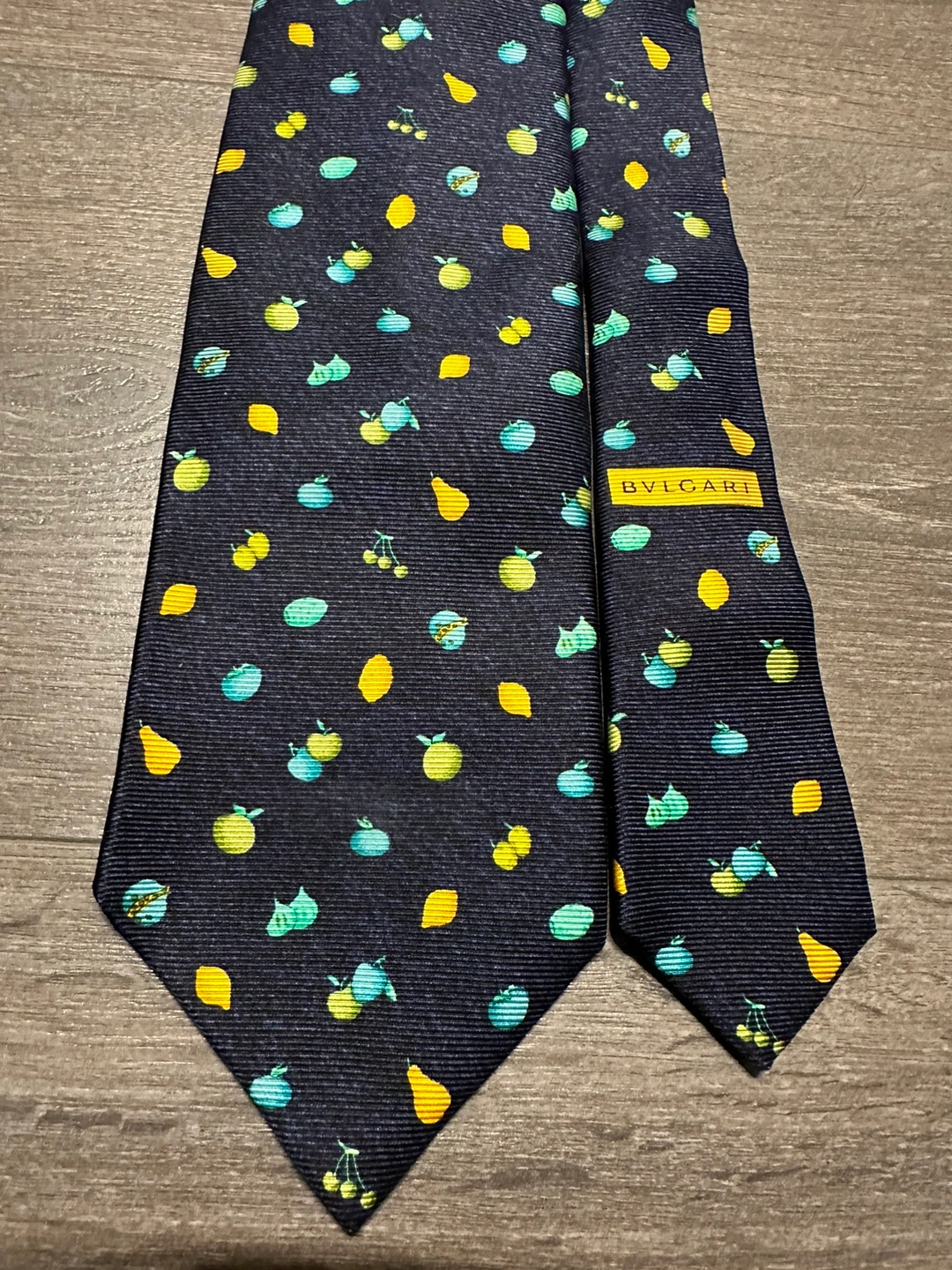 100% authentic Bulgari silk tie A navy blue silk tie with a pattern of lemons, pears, cherries, and figs. Great condition Imperfection on the inner label shown in photos